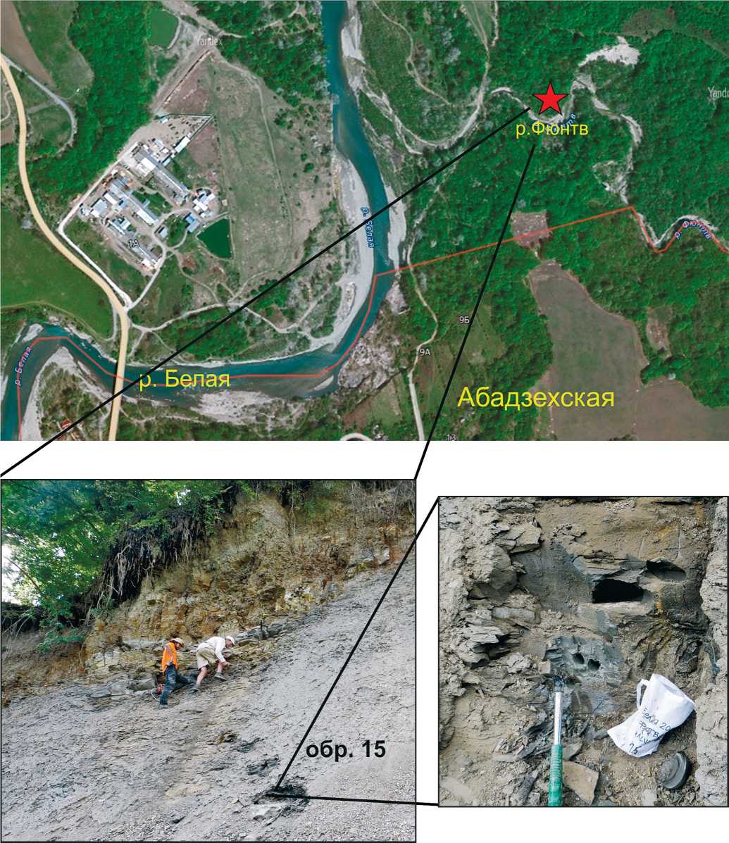 Рис. 6. Местоположение разреза алкунской свиты по руч. Фюнтв (приток р. Белая) и положение образца 15 с обилием наннопланктона и планктонных фораминифер.