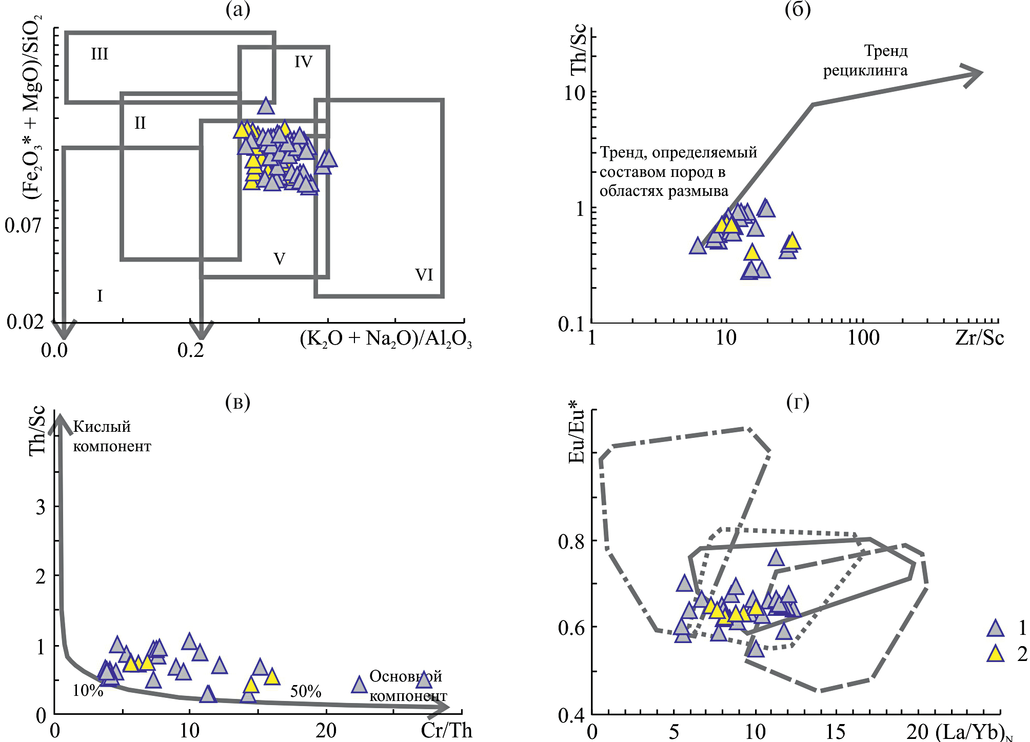 Рис. 10. Положение точек состава аргиллитов венда Юго-Восточного Беломорья на диаграммах (K2O + Na2O)/Al2O3–(Fe2O3* + MgO)/SiO2 (а), Zr/Sc–Th/Sc (б), Cr/Th–Th/Sc (в), (La/Yb)N–Eu/Eu* (г).