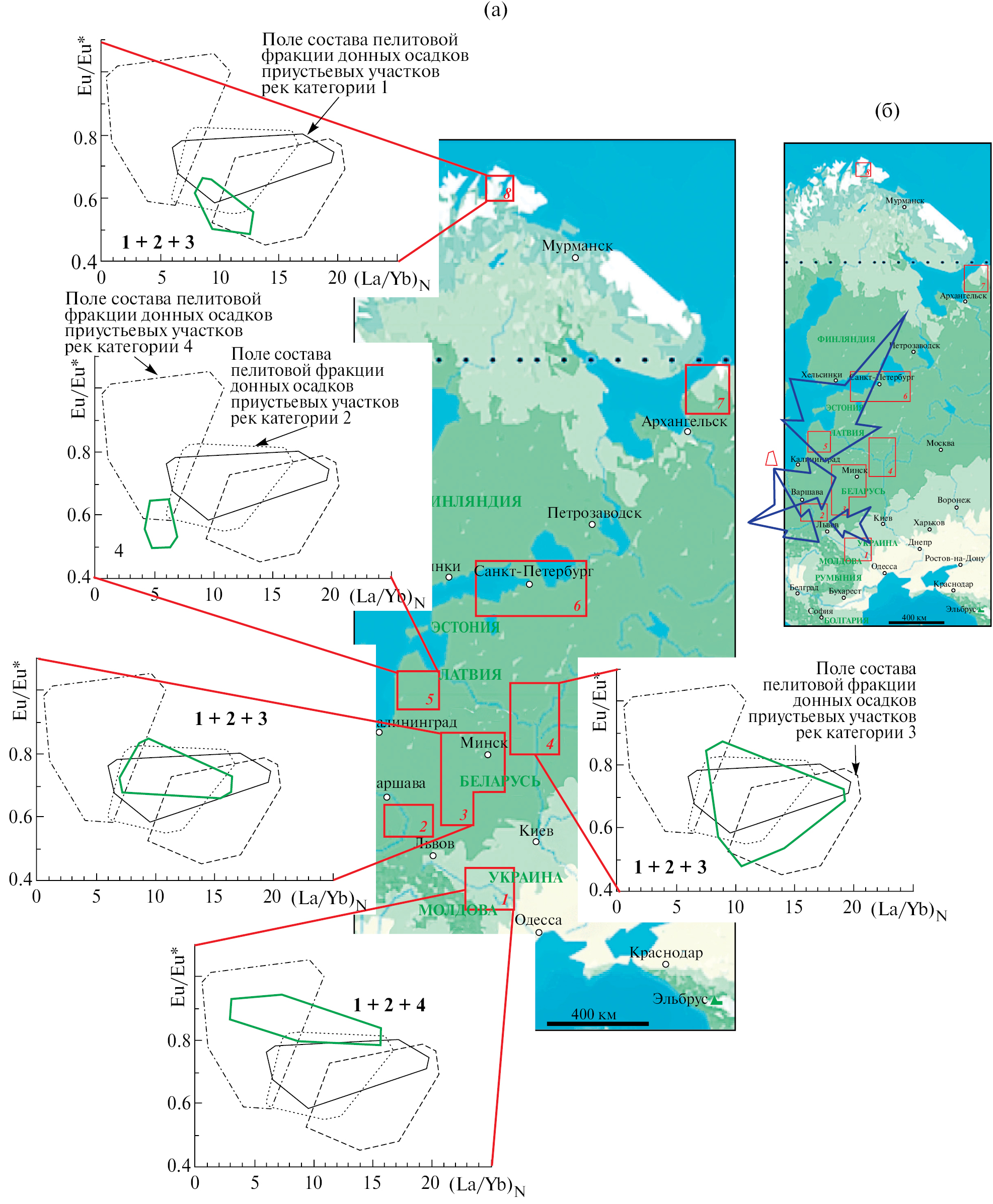 Прежде чем перейти к анализу фактического материала, рассмотрим кратко положенные в основу наших исследований представления. В публикации (Bayon et al., 2015) приведены результаты изучения более 50 специальным образом (удаление нетерригенных носителей редкоземельных элементов) подготовленных проб алевритовых (2–63 мкм) и пелитовых (<2 мкм) фракций донных осадков приустьевых частей современных рек. Среди последних авторы указанной работы наметили ряд категорий: 1) крупные реки (World’s major rivers), т.е. реки с площадью водосборного бассейна >100000 км2 (рр. Амазонка, Конго, Миссисипи, Нигер, Янцзы, Мак-Кензи, Волга, Ориноко, Дунай, Меконг, Желтая, Аму-Дарья, Сев. Двина и др.); 2) реки, дренирующие осадочные образования (rivers draining “mixed/sedimentary” formations), площадь водосборного бассейна которых составляет <100000 км2 (рр. Сена (Франция), Флай (Новая Гвинея), Гуадиана (Испания и Португалия), Чубут (юг Аргентины), Мэкхлонг (запад Таиланда), Шэннон (Ирландия) и др.); 3) реки, питающиеся продуктами размыва “магматических/метаморфических” террейнов (rivers draining “igneous/metamorphic” terranes) (рр. Карони, Аро и Каура (Венесуэла), Нарва (Россия, Эстония), Кюмийоки (Финляндия), Уме (север Швеции) и др.); 4) реки, дренирующие “вулканические” провинции (rivers draining “volcanic” rocks) (рр. Камчатка (Россия), Уаикато (Новая Зеландия), Нижний Бэнн (Северная Ирландия), Мэн и Сикс Майл (Ирландия) и др.).