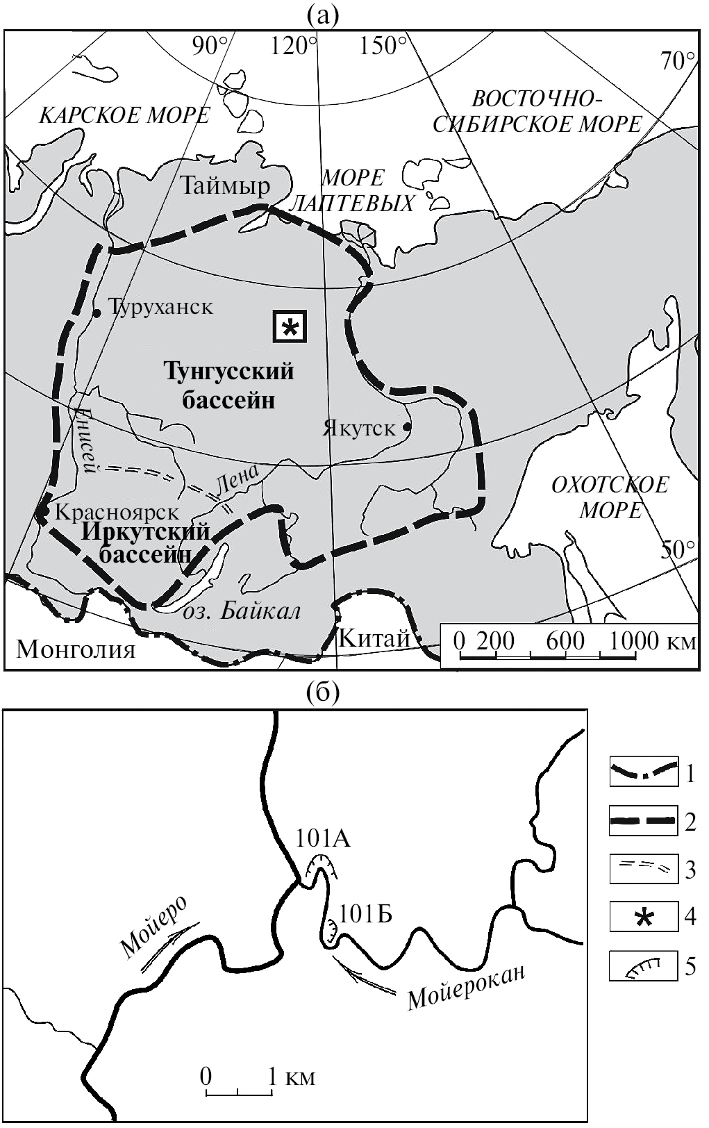 (а) – местоположение района исследования; (б) – расположение изученных обнажений: 1 – границы Российской Федерации; 2 – границы Сибирской платформы; 3 – условные границы Тунгусского и Иркутского осадочных бассейнов; 4 – местоположение района исследования; 5 – изученные обнажения (обн. 101А, 67°22´10˝ с.ш., 104°05´21˝ в.д.).