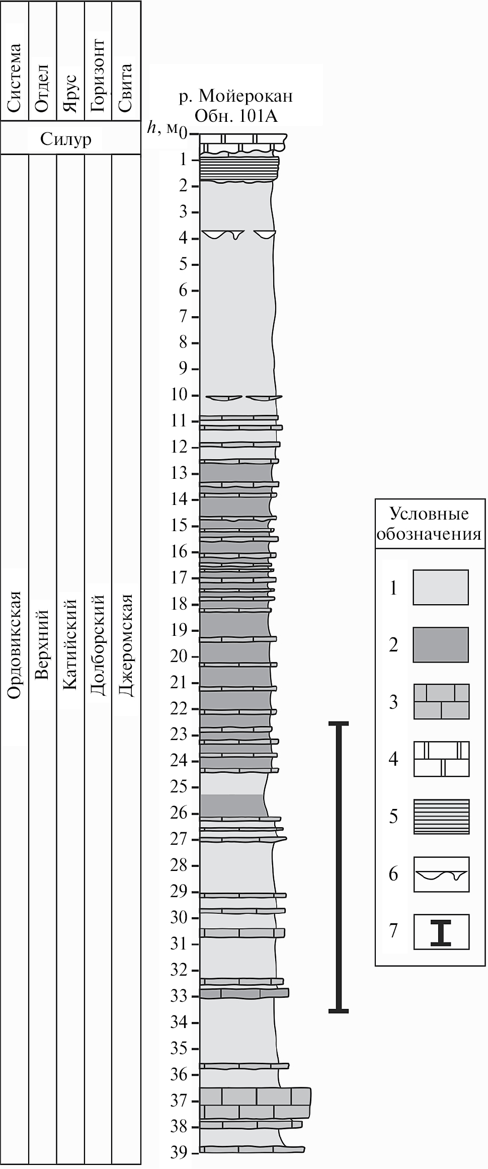 Разрез верхней части джеромской свиты (долборский горизонт, катийский ярус верхнего ордовика; Каныгин и др., 2017) в обнажениях №№ 101А и 101Б по р. Мойерокан (рис. 1б) состоит из слоев биокластических известняков мощностью от 1.5–3.0 до 5.0–12.0 см, которые чередуются со слоями зеленовато-серых или вишнево-красных алевролитов (рис. 2). Слои биокластических известняков представляют собой штормовые отложения (темпеститы), а слои алевролитов – фоновый осадок. И те и другие сформировались в дистальной части холодноводного рампа на глубинах между областью воздействия обычных и штормовых волн (Dronov, 2013, 2017).