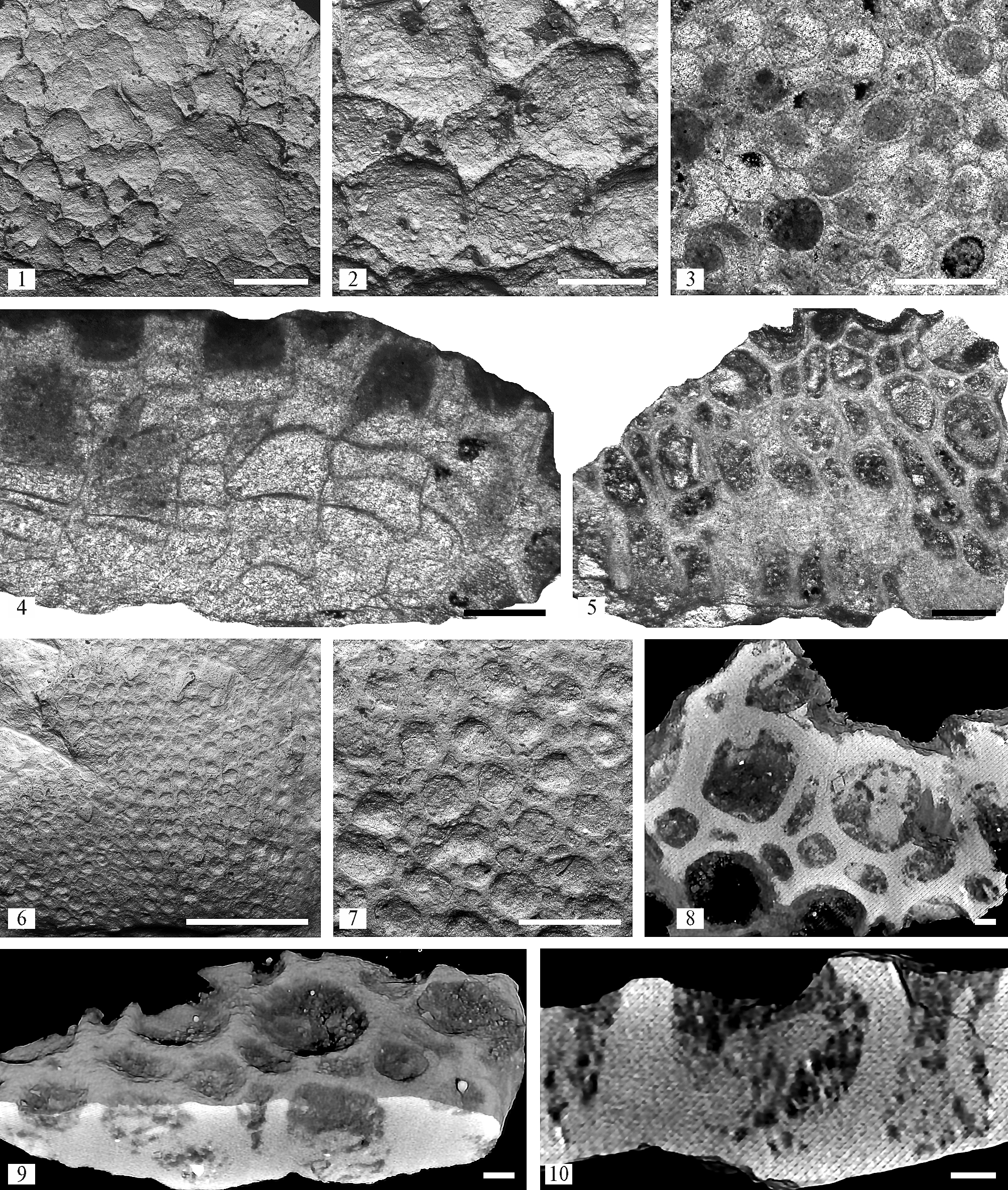 1–4 – Calloporella sp. 1, экз. ПИН, № 5846/4; 5–10 – Calloporella sp. 2, экз. ПИН, № 5846/5. Длина масштабной линейки 2 мм для фиг. 6; 500 мкм для фиг. 1, 3, 7; 250 мкм для фиг. 4, 5; 200 мкм для фиг. 2; 50 мкм для фиг. 8–10.