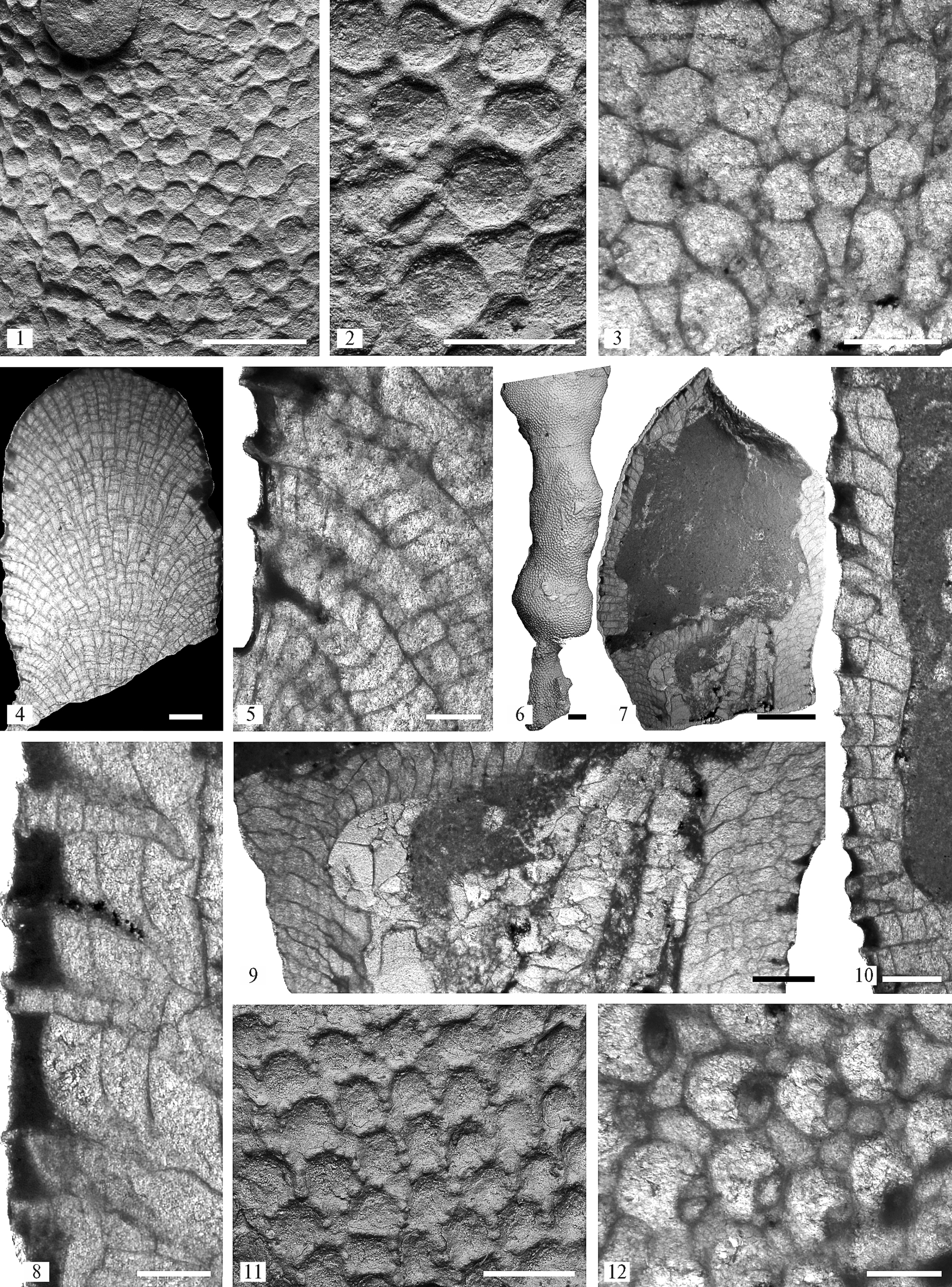 Таблица I. Мшанки отряда Cystoporata (подотряд Fistuliporina) из верхней части джеромской свиты; СЭМ (фиг. 2–5, 8–10) и шлифы (фиг. 6, 7, 11, 12).