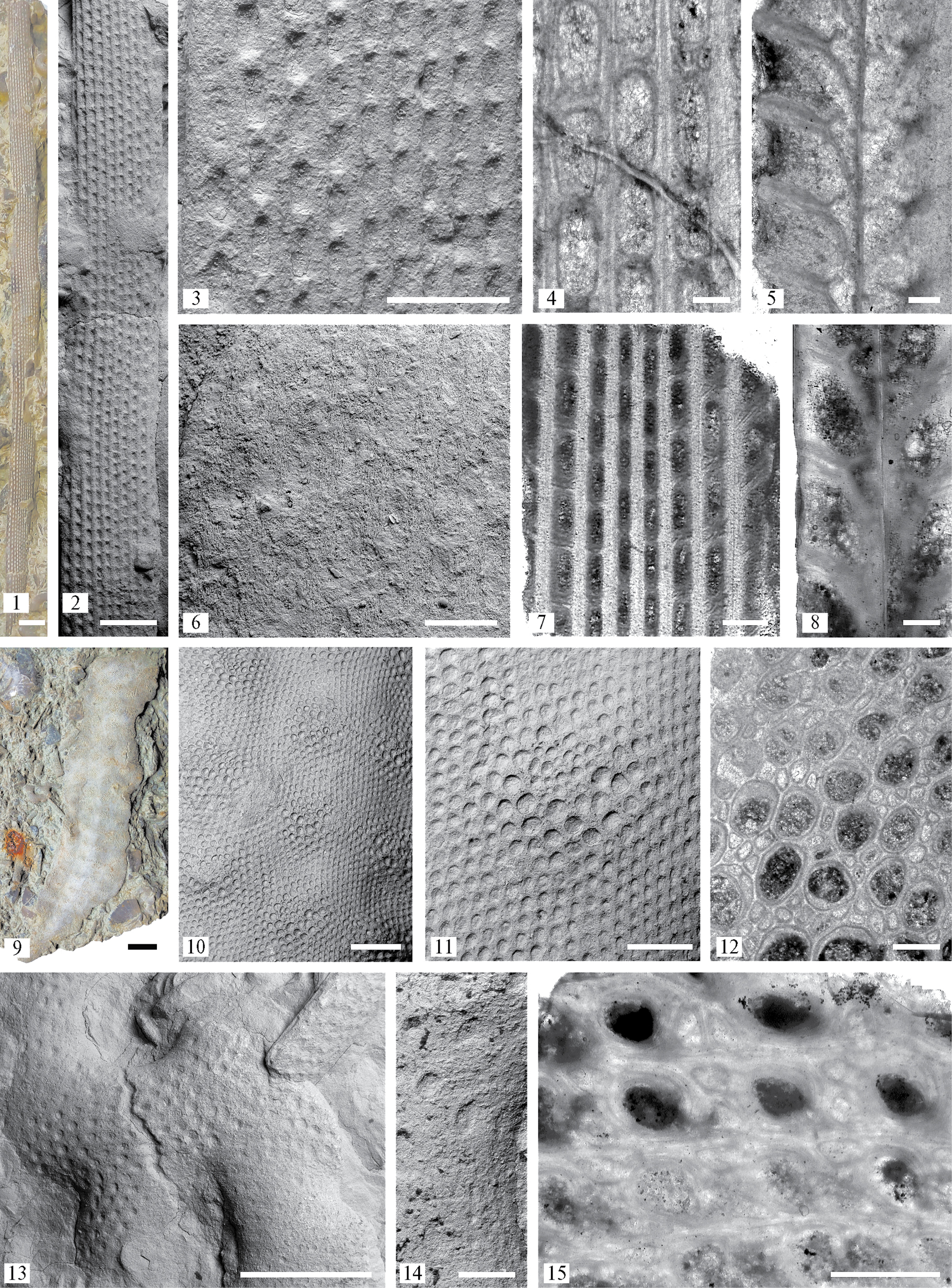 1–8 – Phaenopora carinata Nekhoroshev: 1–5 – экз. ПИН, № 5846/20, 6–8 – экз. ПИН, № 5846/21; 9–12 – P. viluensis Nekhoroshev, экз. ПИН, № 5846/22; 13–15 – Phaenoporella sp., экз. ПИН, № 5846/23. Длина масштабной линейки 1 см для фиг. 9; 2 мм для фиг. 1, 10, 13; 1 мм для фиг. 2, 11; 500 мкм для фиг. 3; 250 мкм для фиг. 7, 12, 14, 15; 200 мкм для фиг. 6; 100 мкм для фиг. 4, 5, 8.