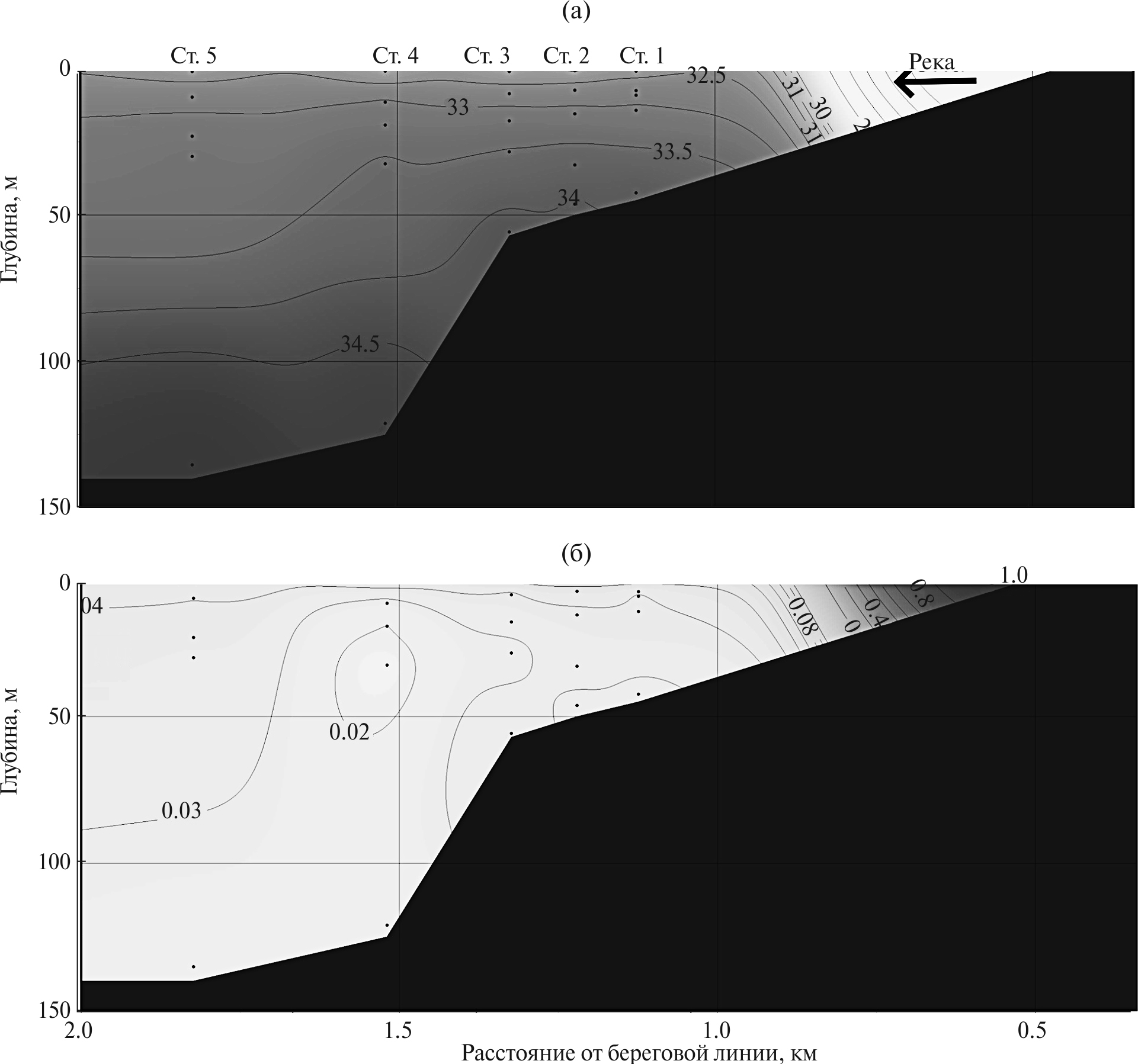 Наибольшие градиенты изменения солености обнаружены в слое 0–5 м, где наблюдались самые низкие значения – от 30 до 32.8 епс. Понижение солености обусловлено влиянием речного стока. В более глубоких слоях воды соленость повышается до 34.89 епс. На глубоководных точках отбора в слое от 75 м до дна изменения солености незначительны, от 34.50 до 34.89 епс.