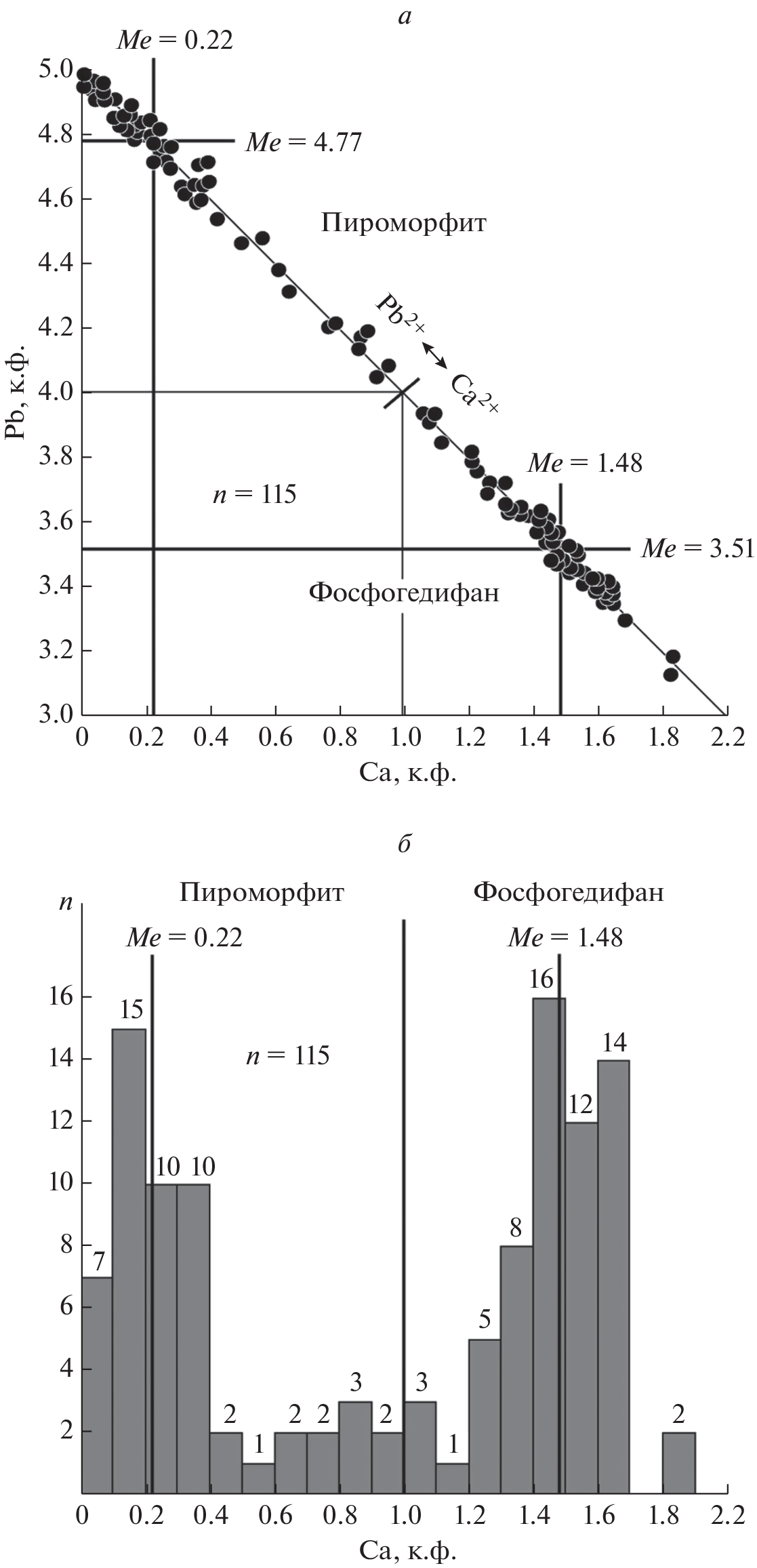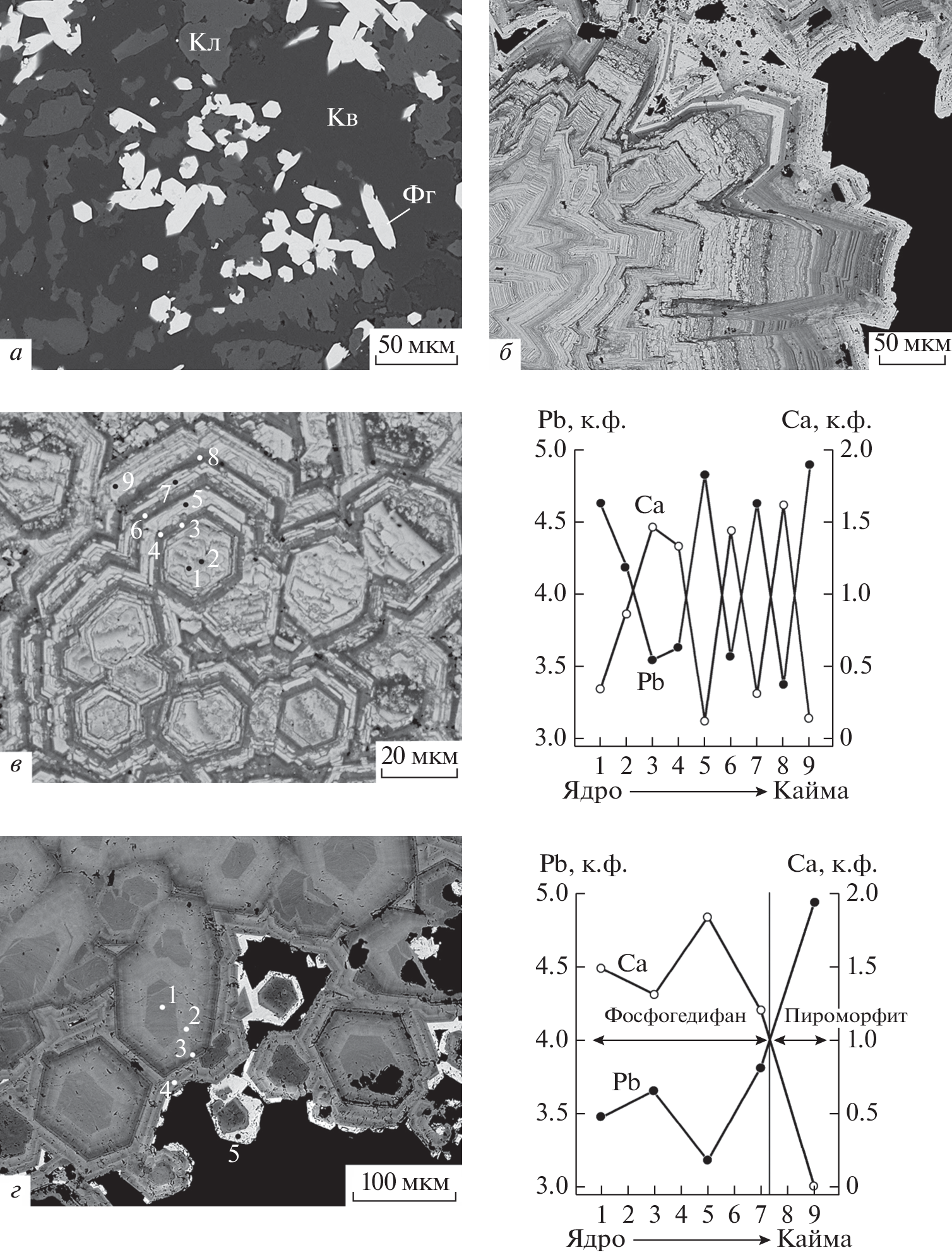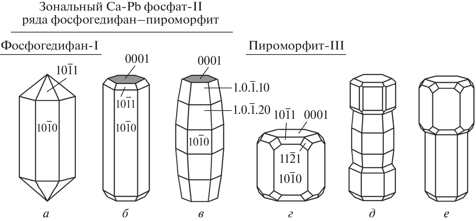 The paper describes Ca-Pb phosphates—pyromorphite and phosphohediphane from the oxidation zone of barite-lead (calcite-barite-galena) ores of the Ushkatyn-III deposit in Central Kazakhstan. Both minerals occur equally frequently within the deposit. Lead phosphates coexist with minerals as almost unaffected by surface changes in ores (galena, pyrite, barite, calcite, rhodochrosite, chamosite, and others), so with minerals of highly oxidized ores (cerussite, montmorillonite, kaolinite, goethite, and others). As the processes of supergene processes develop (during the transition from weakly to strongly oxidized ores), the compositions of newly formed phosphates change regularly in the following consequence: phosphohedifane → rhythmically zonal Ca-Pb phosphate → pyromorphite. At the same time, the habit (and appearance) of mineral crystals changes from dipyramidal-prismatic through elongated prismatic (barrel-shaped) to pinacoidal-prismatic (short-columnar). Crystallization of pyromorphite is possible already at very low concentrations of lead, phosphorus and chlorine in solution. The main source of chlorine is groundwater, and phosphorus is coming from the organic matter of the soil cover overlying ore-bearing deposits. Peculiarities of the chemical composition and crystal structure of Ca-Pb phosphates, as well as the nature of their mineral associations, suggest the presence of a discontinuity in isomorphic miscibility in the series pyrofmorphite–phosphohedifane and phosphohedifane–chlorapatite.