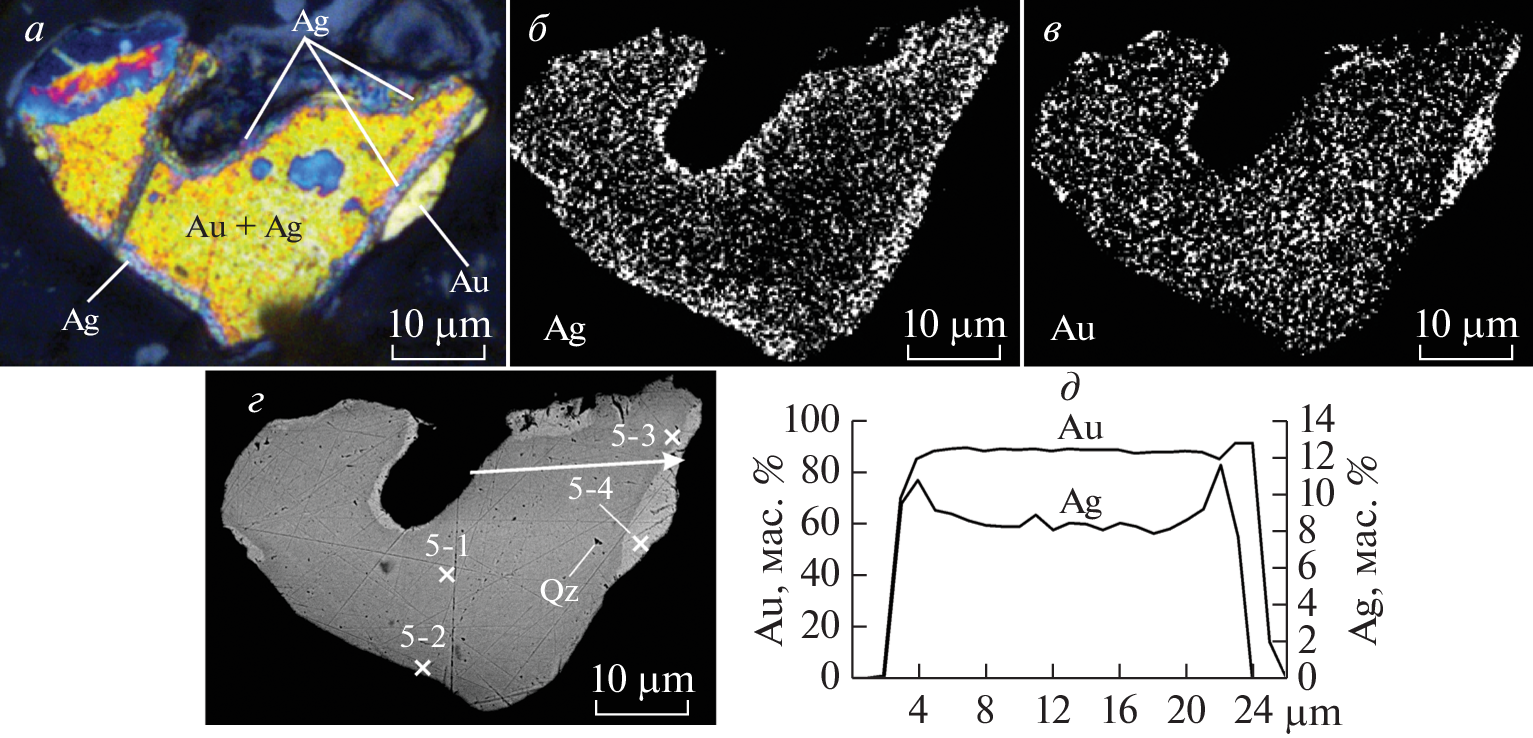 The results of a comprehensive study of the morphology, composition and the internal structure of fine autigenic gold, first discovered in bedrock on the area of the Kyvvozhskoye goldfield, are presented. It has complex specific rounded-lumpy, lumpy-branched aggregate forms and a smooth growth surface without traces of mechanical wearing. X-ray studies (Debye-Scherrer method) show that reflexes in the form of dashed rings are characteristic of debyeograms of this native gold, which, according to the authors, indicates the absence of exogenous deformations of it. The internal structure of all the studied gold pieces is characterized by a relatively homogeneous inner area and a thin (~1 µm) contrasting enriched with silver low-grade rim. All the particles of the studied native gold have approximately the same average fineness (899–918‰). As a mechanism for the formation of the found autigenic gold, its crystallization is assumed by filling of the free pore space of the host sandstones. Its presence in Riphean rocks is considered as an indicator of the primary dispersion halos and is a direct search sign of the development of potentially productive gold mineralization in this part of the Middle Timan.