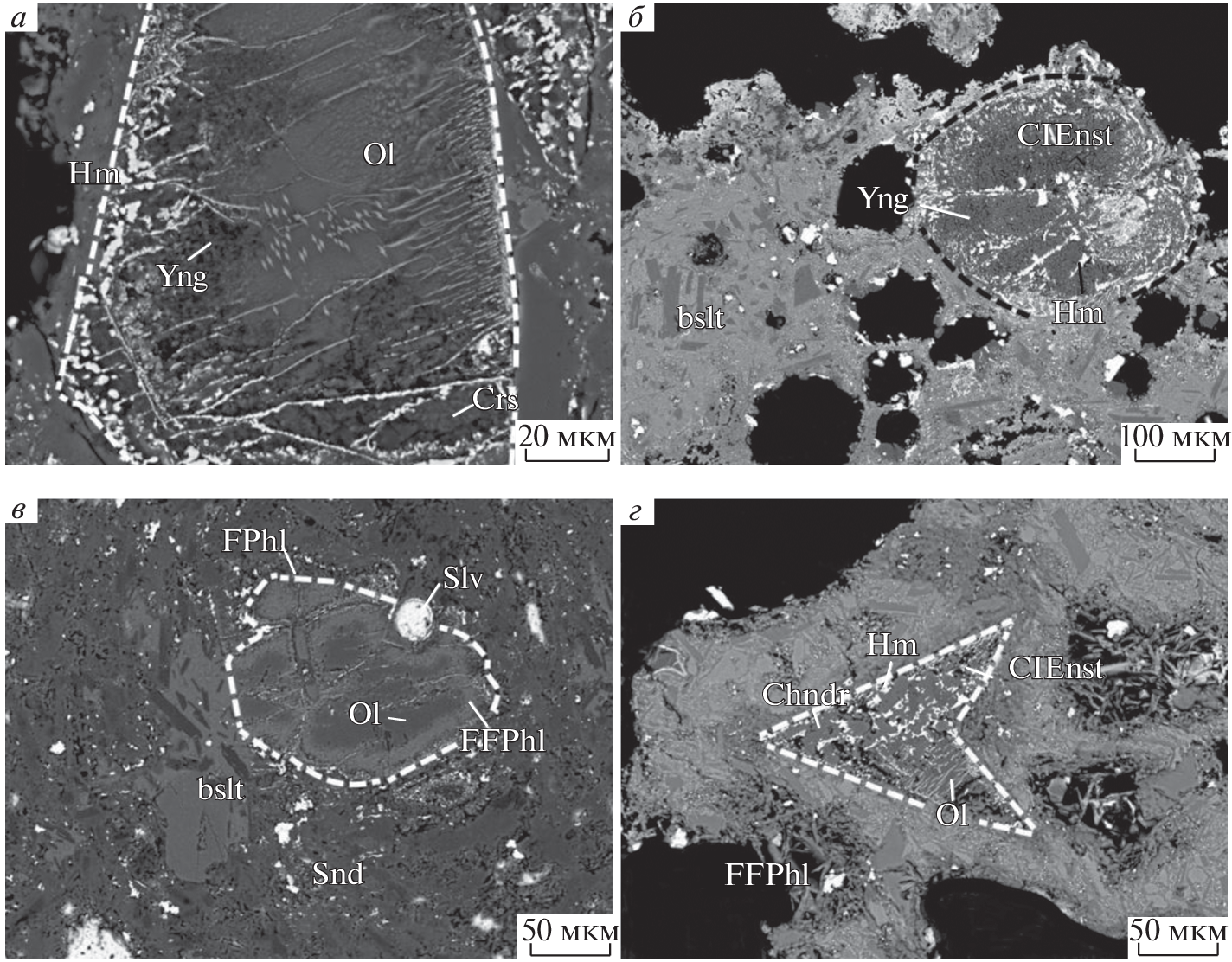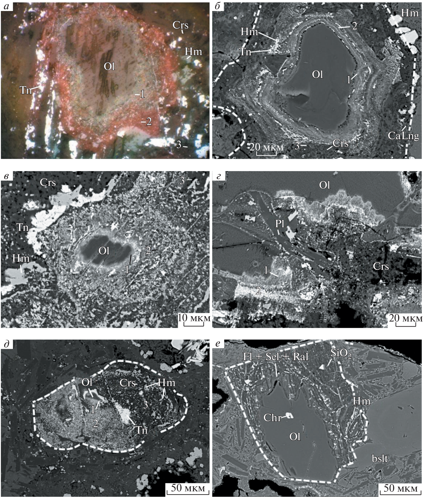 This paper is devoted to the olivine pseudomorphization processes occurring in basalt under the action of high-temperature O2-rich gas in oxidizing-type fumaroles at the Tolbachik volcano (Kamchatka, Russia). The alteration of olivine with composition Fo72–90 in a terraneous oxidizing-type exhalation system involves two independent processes: (1) oxidative breakdown (above 600 °C) with the formation of forsterite Fo90–100 together with hematite, magnesioferrite, and, presumably, “magnesian laihunite”; (2) replacement by mineral aggregates in which pyroxenes [enstatite, clinoenstatite, diopside, aegirine-augite (Ca0.5Na0.5)(Mg0.5Fe0.5)Si2O6], low-alumina fluoromagnesian micas (yangzhumingite and fluorotetraferriphlogopite), chondrodite or cristobalite are the main components accompanied by hematite, sometimes with magnesioferrite or tenorite. In the active Arsenatnaya fumarole, the change of the main Si minerals in pseudomorphs with the gas temperature decrease occurs in a sequence that generally reflects an increase in the degree of condensation of tetrahedral Si-O motifs: olivine (forsterite) → orthopyroxene (enstatite) → clinopyroxenes → micas → cristobalite.