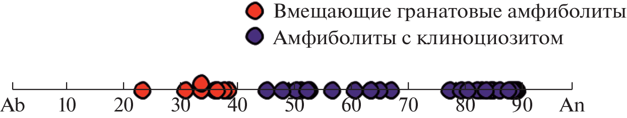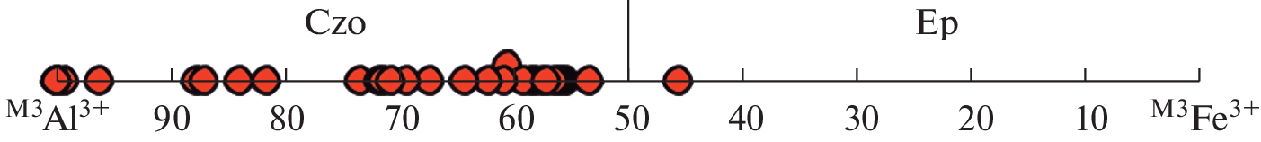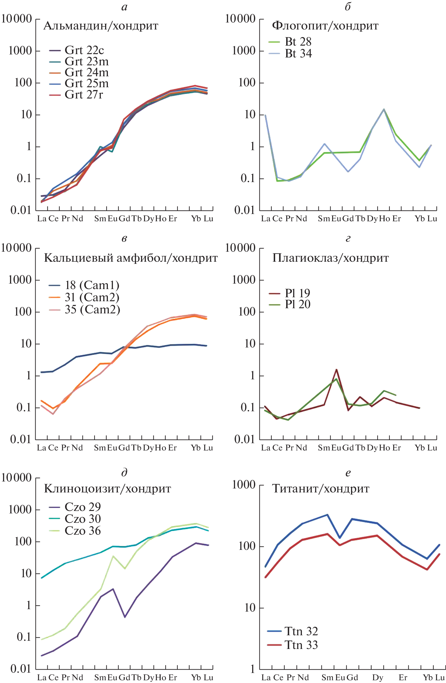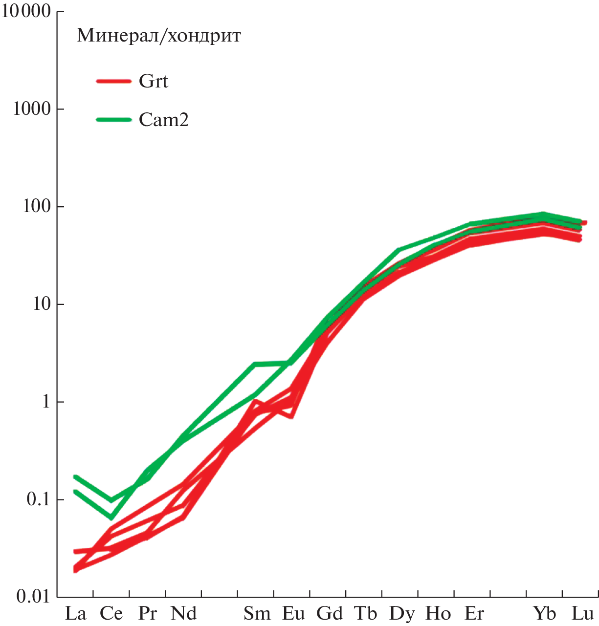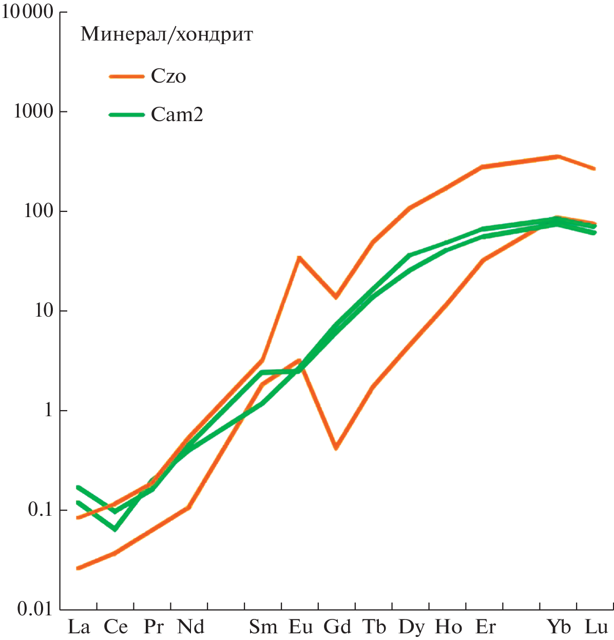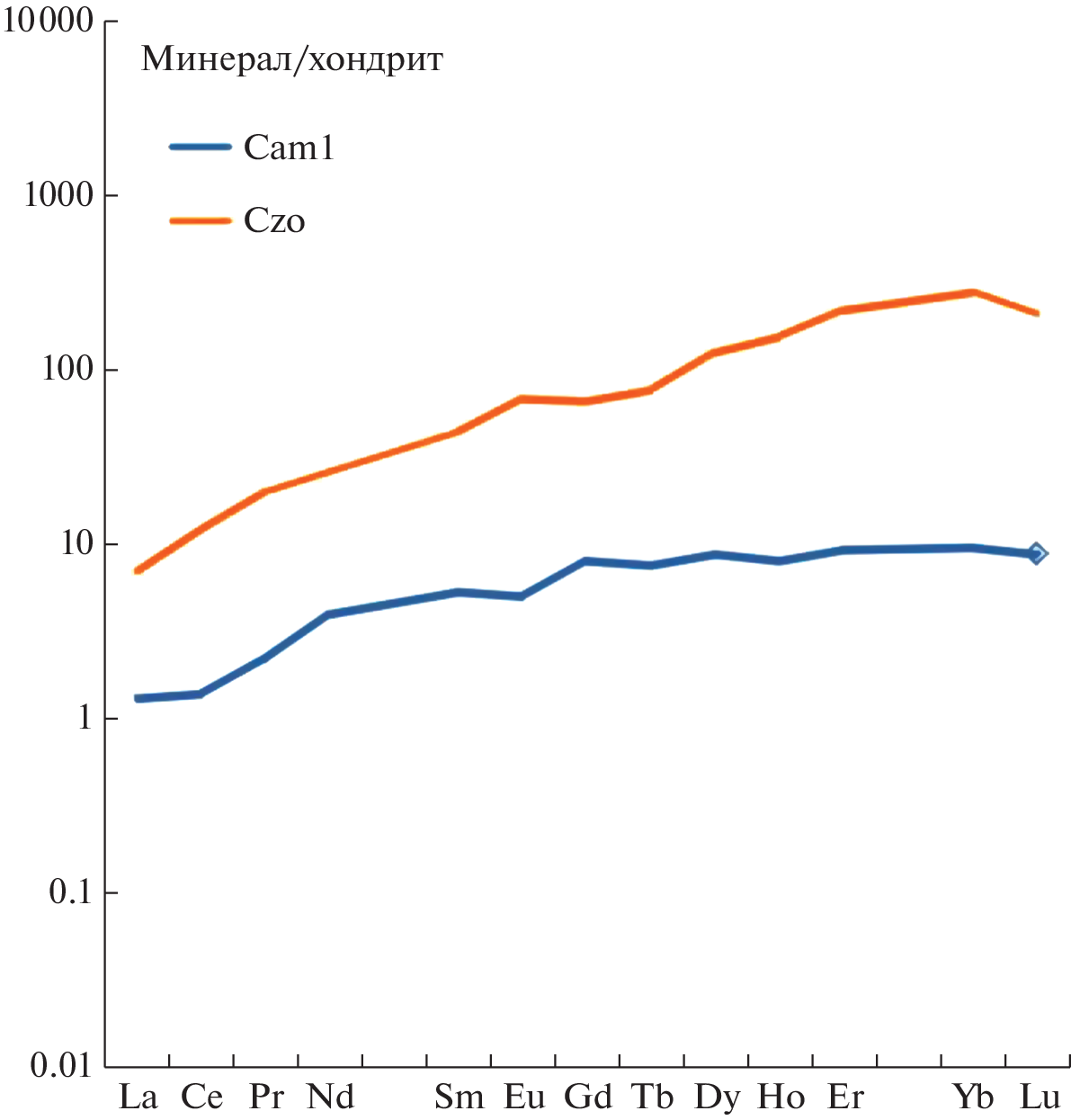 A study of composition of minerals (major and rare-earth elements) of clinozoisite amphibolites closely associated with corundum-bearing rocks at the Khitoostrov occurrence (North Karelia) was carried out. The clinozoisite amphibolites contain ferruginous phlogopite containing more Al than the ferruginous phlogopite in the host garnet amphibolites; calcium amphibole belongs to the chermakite–pargasite–sadanagaite series; the basic plagioclase which is absent in the host rocks, and margarite. Reactionary relationships of minerals are noted – plagioclase-amphibole symplectites around garnet porphyroblasts, development of clinozoisite after calcium amphibole. Some of the minerals (clinozoisite, calcium amphibole) acquire rare-earth elements (REE) distribution spectra that are uncharacteristic for them, inheriting them from substitutable minerals in the areas of distribution of reaction structures: calcium amphibole inherits the spectrum of garnets, and clinozoisite inherits the spectrum of calcium amphibole. The hypothesis of metasomatic origin of clinozoisite amphibolites and the redistribution of REE under the influence of fluid are discussed.