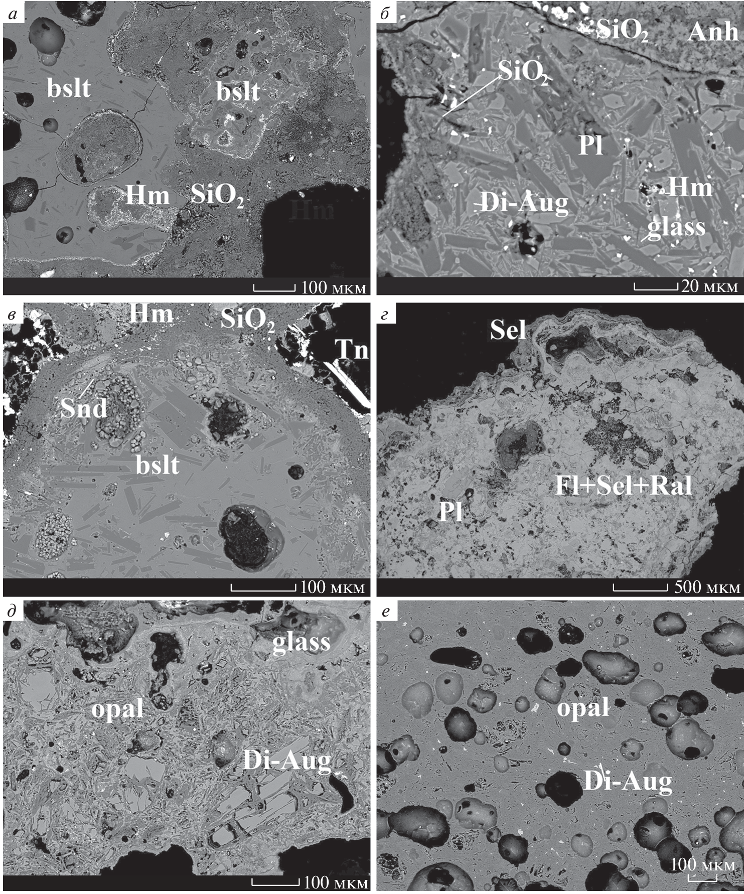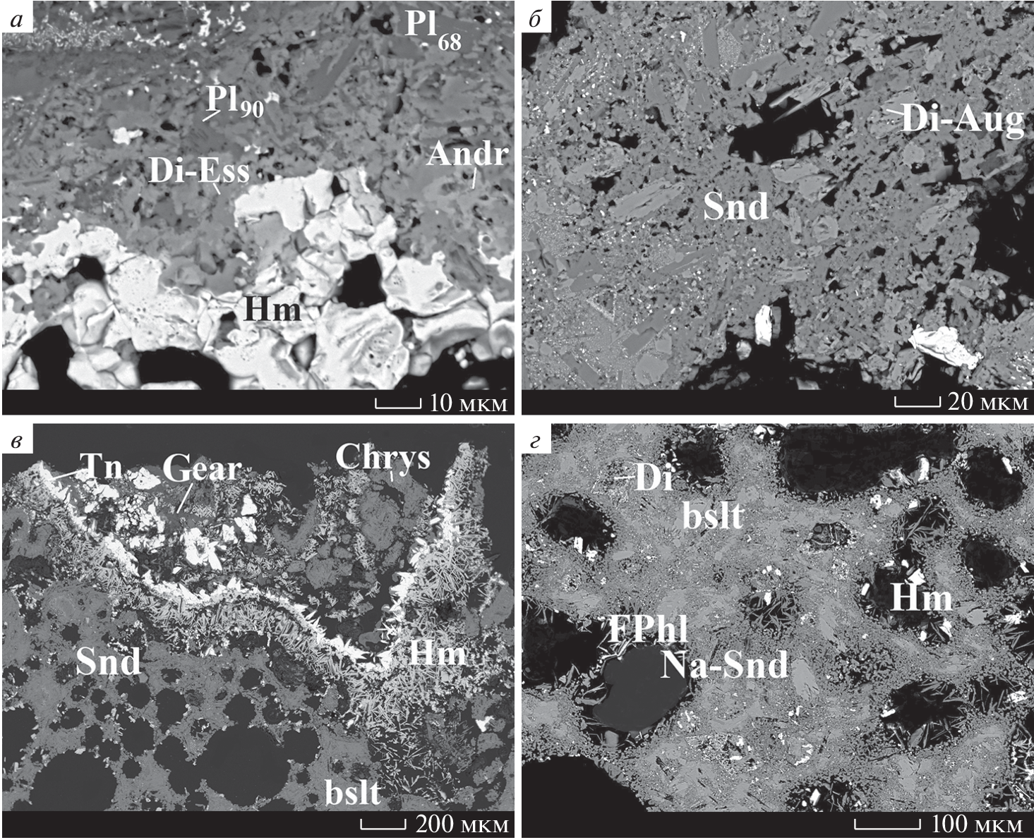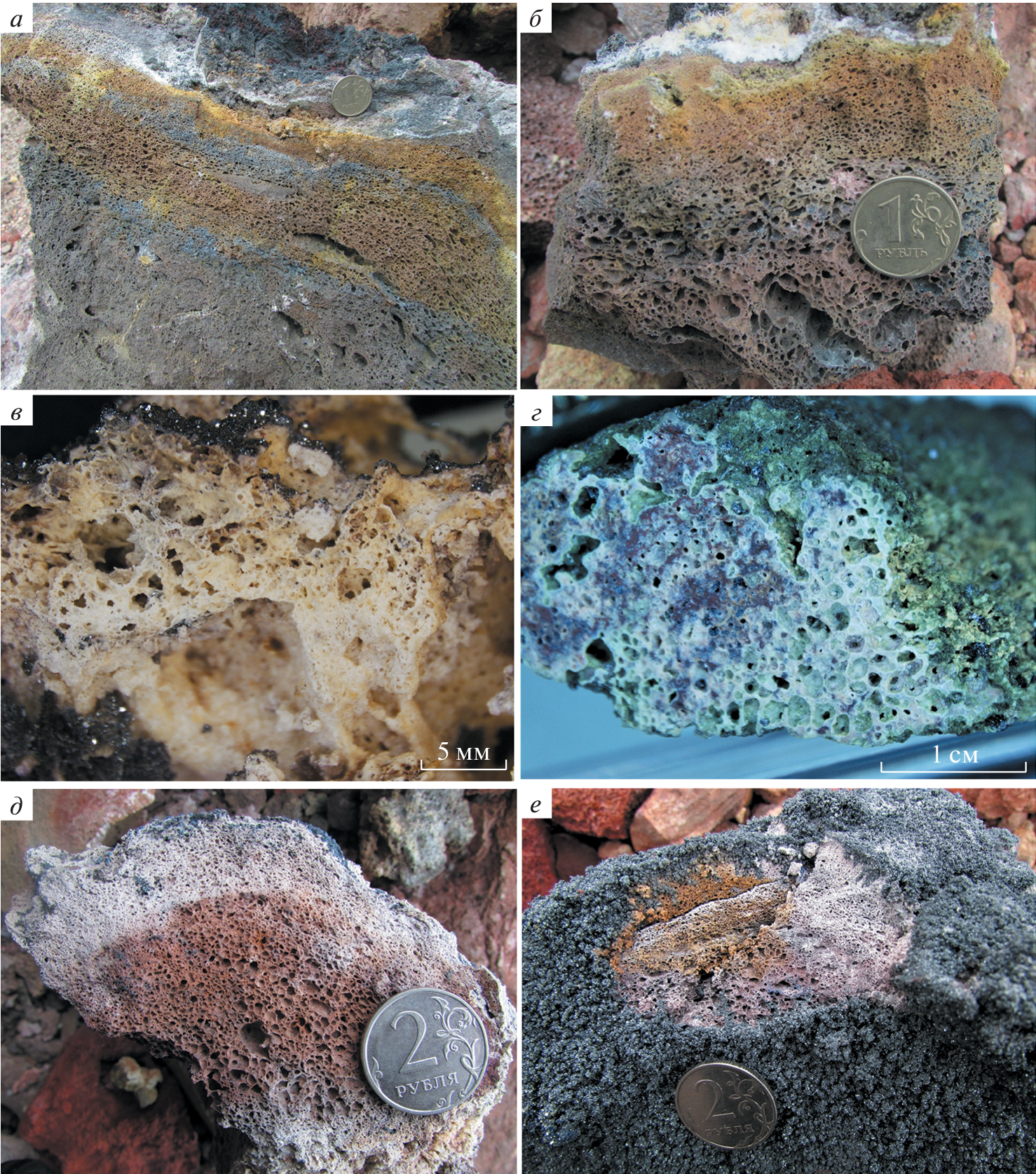 Five specific types of silicate apobasaltic gas metasomatites formed in the temperature range from 850–900 to 450–500 °C have been identified and characterized in oxidizing-type fumaroles at the Tolbachik volcano (Kamchatka, Russia): (1) diopside-esseneite, (2) haüyne-diopside, (3) anorthoclase/Na-sanidine, (4) sanidine, and (5) fluorophlogopite/sanidine-fluorophlogopite metasomatites. Exhalation incrustations of certain mineral and chemical composition are related to each of these types. In the vertical section of the fumarole system from bottom to top, against the background of volcanic gas cooling, a sequential spatial change of the first four types of gas metasomatites occurs. Fluorophlogopite and sanidine-fluorophlogopite gas metasomatites have not a clear position in the vertical section of the fumarole system and presumably are formed under the action of a gas significantly enriched with Cl and F. Highly siliceous metasomatites, consisting mainly of silica phases, form instead of silicate rocks at temperatures below 450–500 °C.