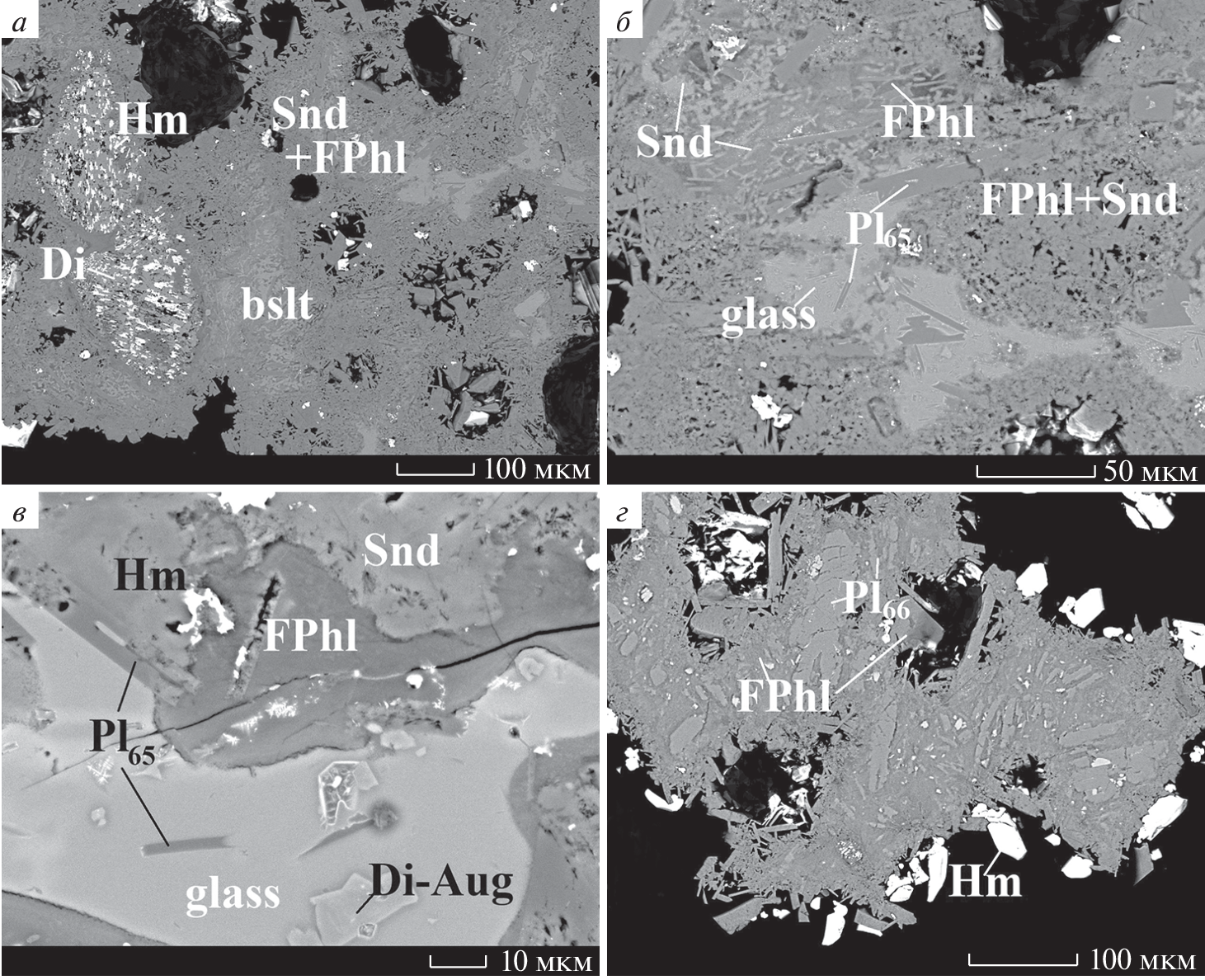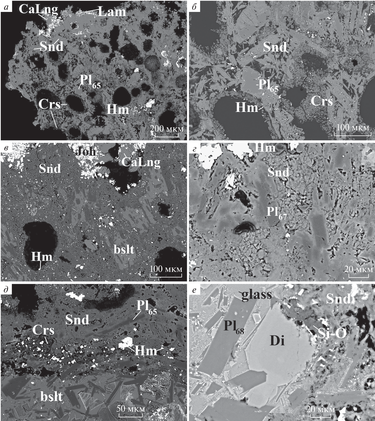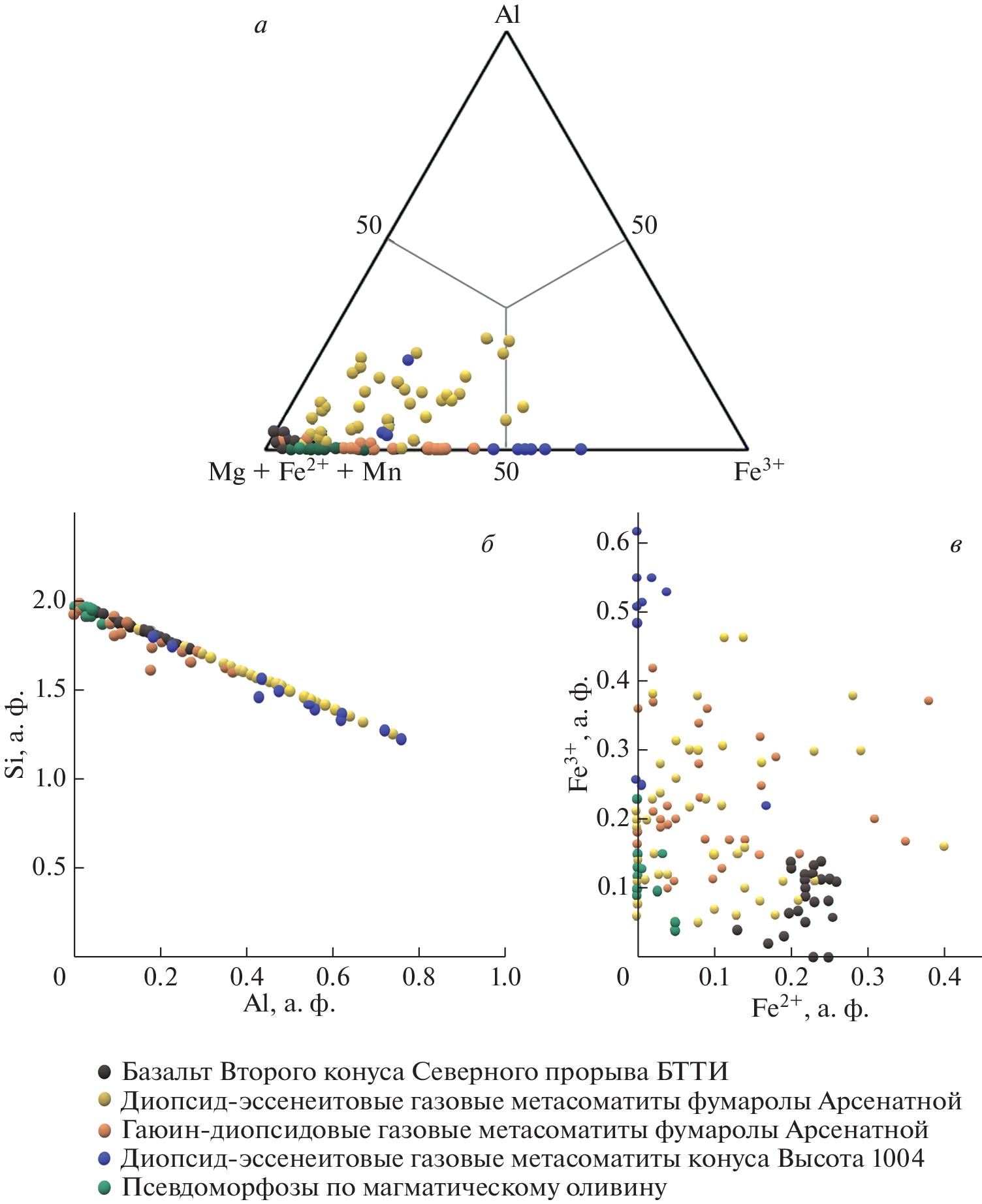 Five specific types of silicate apobasaltic gas metasomatites formed in the temperature range from 850–900 to 450–500 °C have been identified and characterized in oxidizing-type fumaroles at the Tolbachik volcano (Kamchatka, Russia): (1) diopside-esseneite, (2) haüyne-diopside, (3) anorthoclase/Na-sanidine, (4) sanidine, and (5) fluorophlogopite/sanidine-fluorophlogopite metasomatites. Exhalation incrustations of certain mineral and chemical composition are related to each of these types. In the vertical section of the fumarole system from bottom to top, against the background of volcanic gas cooling, a sequential spatial change of the first four types of gas metasomatites occurs. Fluorophlogopite and sanidine-fluorophlogopite gas metasomatites have not a clear position in the vertical section of the fumarole system and presumably are formed under the action of a gas significantly enriched with Cl and F. Highly siliceous metasomatites, consisting mainly of silica phases, form instead of silicate rocks at temperatures below 450–500 °C.