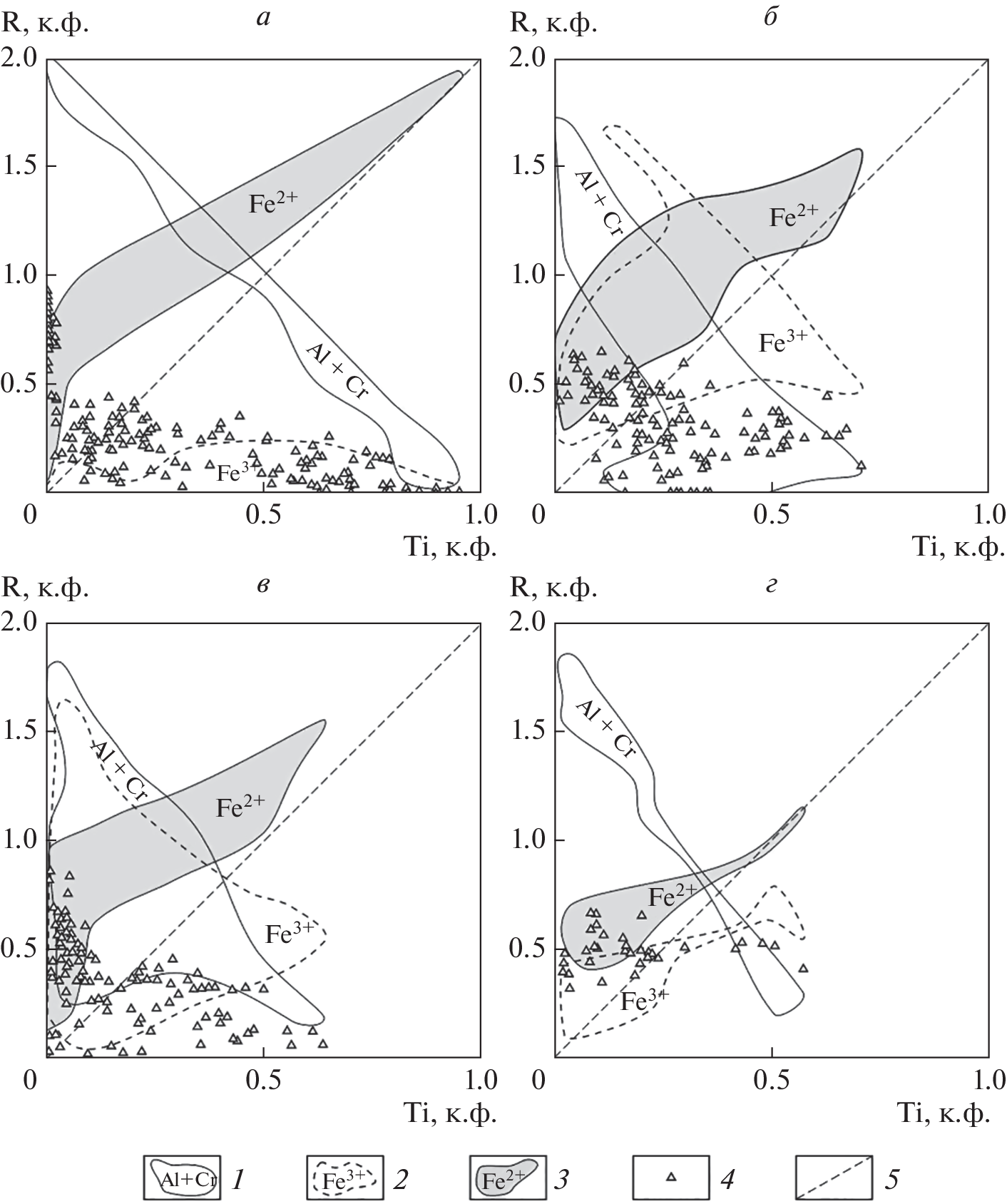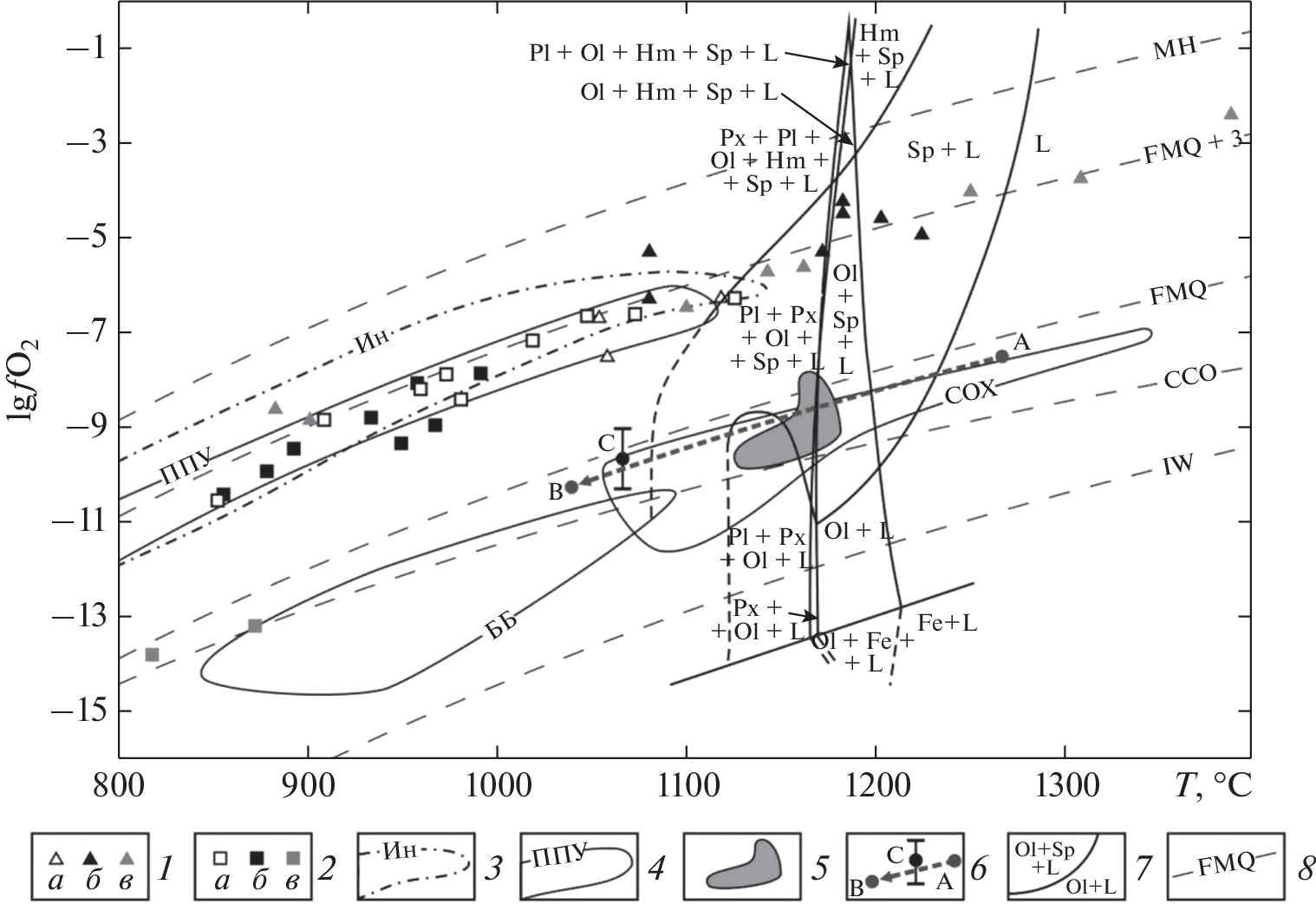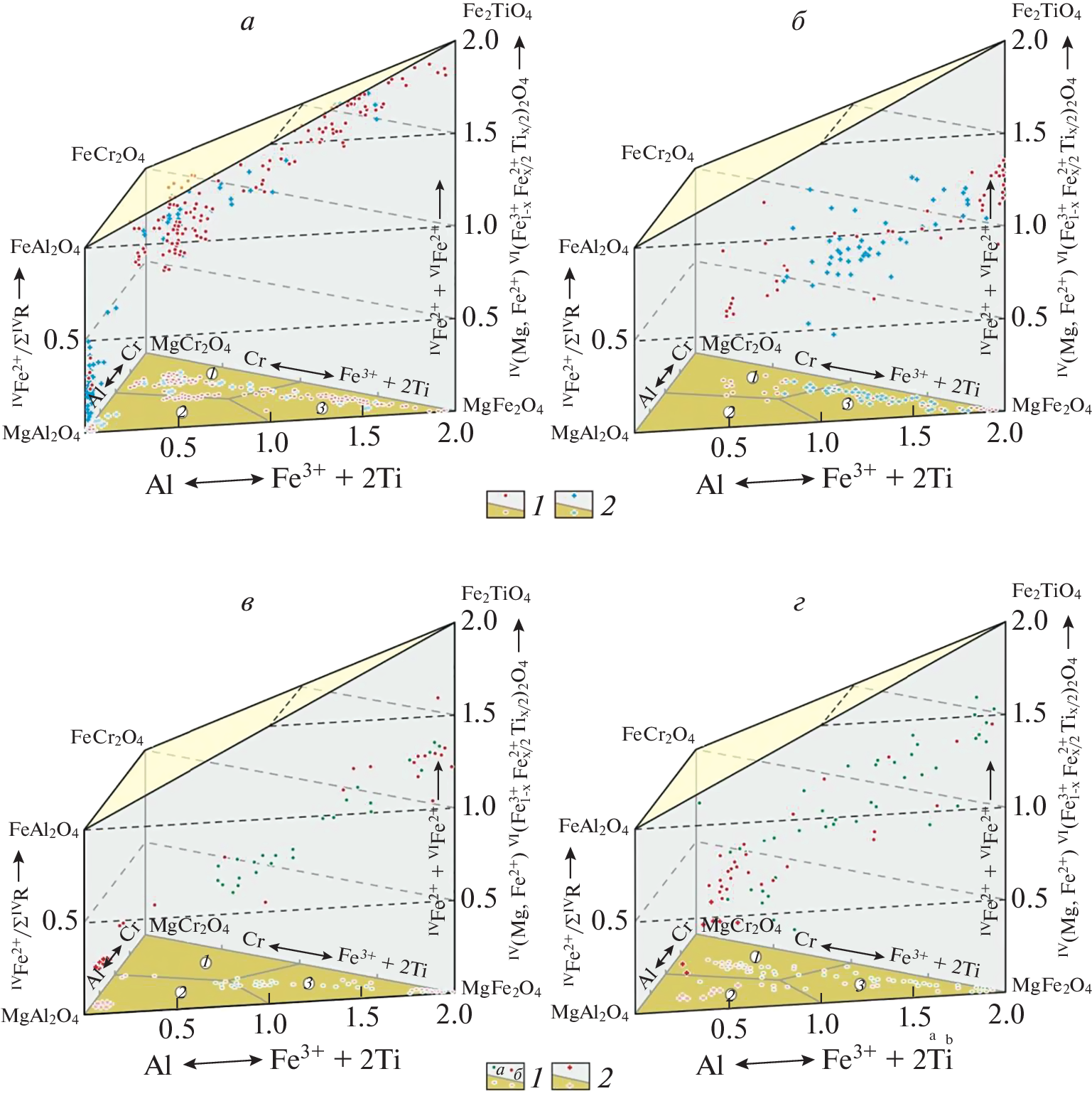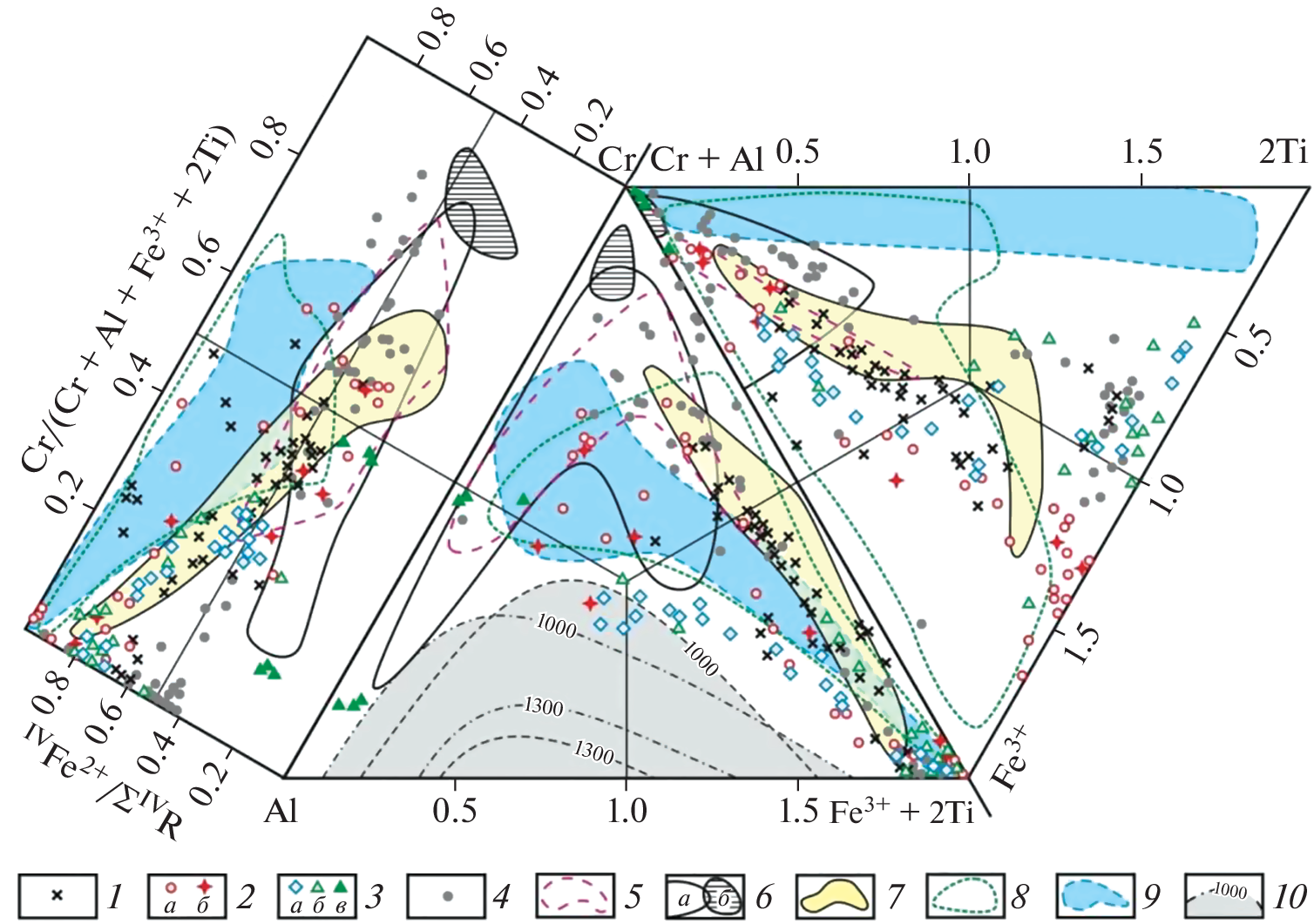 Рассматриваются типохимические особенности шпинелей, образующих непрерывные серии от алюмо-хромшпинелей до ферришпинелей и ульвошпинели из базит-ультрабазитовых пород севера Сибирской платформы. На предлагаемой автором модифицированной объемной диаграмме в координатах Al–Cr–(Fe3++ 2Ti)–Fe2+ сравнивается состав этих шпинелей с шпинелями из щелочных базальтов океанических островов и лунных морских базальтов. Установление непрерывной изоморфной серии от хромшпинелей к ульвошпинели является одним из минералогических индикаторов возможной парагенетической связи между пикрит-базальтовыми, щелочными оливин-базальтовыми, щелочно-ультраосновными и кимберлитовыми формациями на севере Сибирской платформы. С помощью оливин-хромшпинелевого окситермобарометра показано, что для изученных пород величина летучести кислорода lg fO2 на 2–4 порядка выше задаваемой буфером фаялит-магнетит-кварц (FMQ) и соответствует состоянию окисленности платиноносных дунит-клинопироксенитовых ассоциаций пород урало-аляскинского и алданского типов.