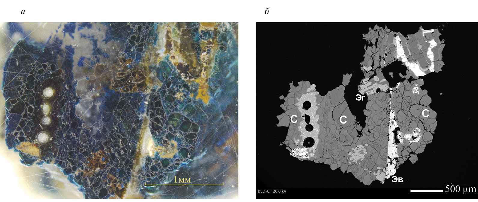 Рис. 2. Обогащенный густоокрашенными синими и сине-зелеными (в результате обжига в костре) зернами минералов ряда содалит — сапожниковит (С) участок фельдшпатоидного сиенита с эгирином (Эг) и минералом группы эвдиалита (Эв): обр. ИП Сейд-4925. Полированный срез: (а) — фотография при обычном освещении, (б) — изображение в отраженных электронах под сканирующим электронным микроскопом. Ширина образца 3 мм.