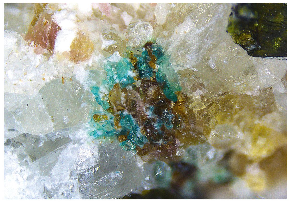 Рис. 4. Яркая голубая кайма вокруг коричневого сростка зерен высокоториевого стенструпина-(Ce), вросшего в бесцветный зернистый агрегат фельдшпатоида, отвечающего по составу середине ряда содалит — сапожниковит (обр. ИП Кар-7671/7734). Желтый минерал — казаковит, красновато-коричневатый — член группы эвдиалита. Ширина поля снимка 2 мм.