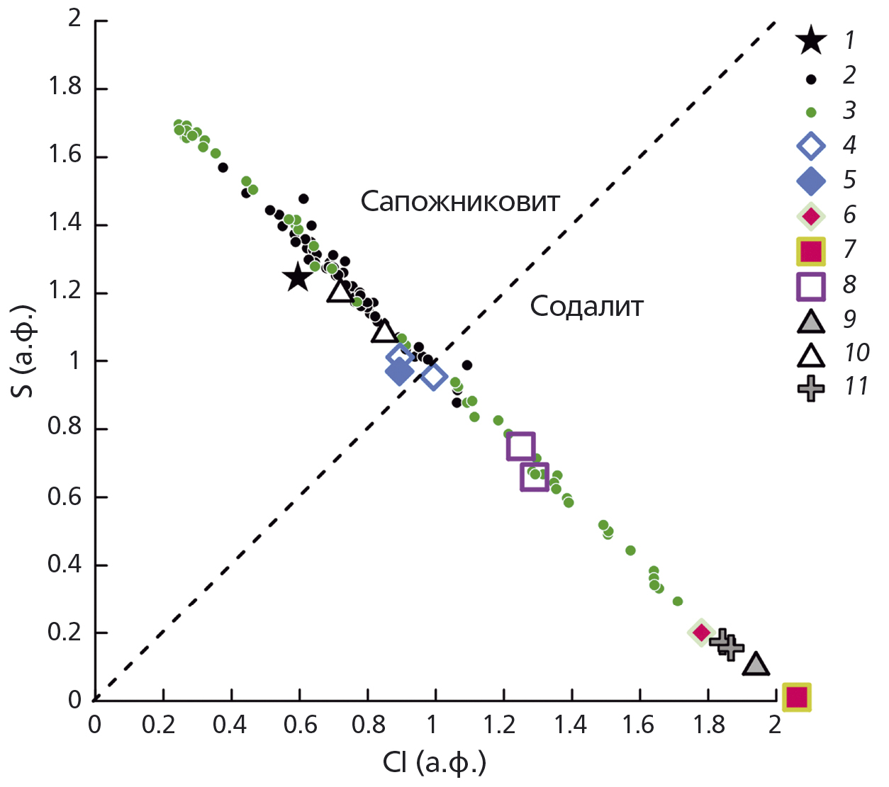 Наши данные вкупе с литературными (Borgström, 1901; Воробьева, 1943; Герасимовский и др., 1966, 1969; Буссен, Сахаров, 1972) показывают, что в Ловозерском массиве минералы группы содалита — это главные концентраторы не только хлора, но и серы. Наряду с содержащим 2.5–3.5 мас. % S нозеаном, который выступает породообразующим компонентом нозеановых и нефелин-нозеановых сиенитов, важнейшими носителями серы в этом массиве являются члены ряда содалит—сапожниковит. Породы, богатые содалитом-гакманитом, широко распространены в Ловозере (шире, чем породы с нозеаном), и если ранее для этого массива описывался породообразующий гакманит с содержанием серы, как правило, не более 0.5 мас. % (в пегматитах и пегматоидах — до 1.1 мас. % S: Буссен, Сахаров, 1972), то нами найдены пойкилитовые фельдшпатоидные сиениты, где породообразующим является сапожниковит, в котором концентрация серы достигает 5.7 мас. %, или (чаще) промежуточные члены ряда содалит—сапожниковит с 2–3 мас. % S. Возможно, они распространены еще шире, чем это сейчас представляется, но ранее пропускались, поскольку не отличаются визуально и при оптическом исследовании в шлифах от обычных науяитов и тавитов.