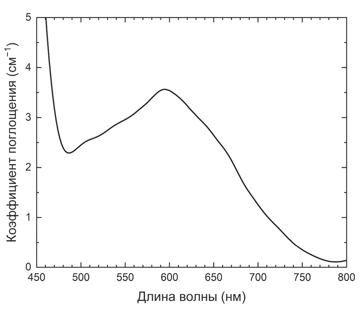 Рис. 11. Спектр оптического поглощения подвергшегося обжигу в костре промежуточного члена ряда содалит — сапожниковит (обр. ИП Сейд-4925), измеренный при комнатной температуре.
