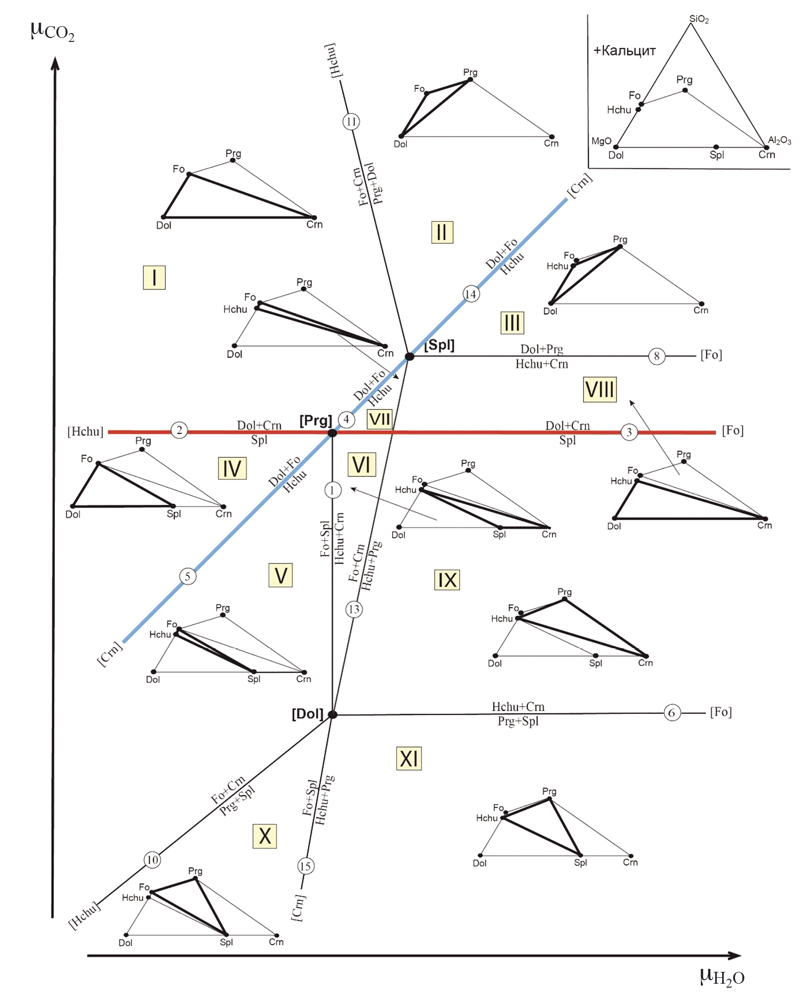 Расчет уравнений химических реакций (табл. 2), определяющих положение линий моновариантного равновесия, производился для теоретических (нормативных) составов минералов (табл. 1), химизм которых наиболее близок к их природным аналогам. Построенная диаграмма полностью представлена на рис. 2. Следует отметить, что три реакции – 7, 9 и 12 (табл. 2) – на диаграмме отсутствуют, поскольку нонвариантные точки [Hchu], [Crn] и [Fo] являются метастабильными.