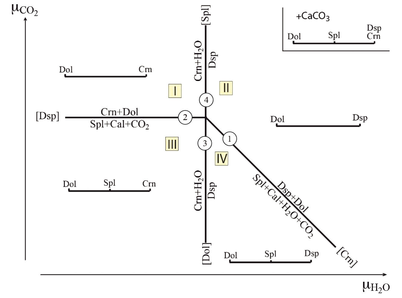 Из диаграммы (рис. 3) следует, что образование шпинели может происходить при пониженной активности СО2 в ходе реакции диаспора и доломита с выделением Н2О и СО2 (реакция 1, поля ). Если в протолите удвоенное число молей диаспора больше числа молей доломита, то в ходе реакции 1 доломит исчезает, а оставшийся диаспор разлагается с образованием корунда, т.е. в поле теоретически устойчивы два парагенезиса доломит + шпинель и шпинель + корунд. С увеличением шпинель разлагается с образованием корунда, и в поле устойчив парагенезис доломит + корунд.
