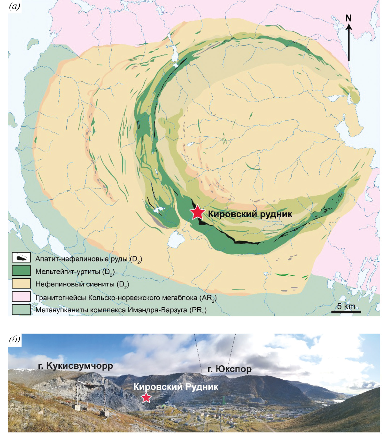Рис. 2. Геологическая схема Хибинского массива (a) и типовое местонахождение икорскиита, отмеченное звездой (б).