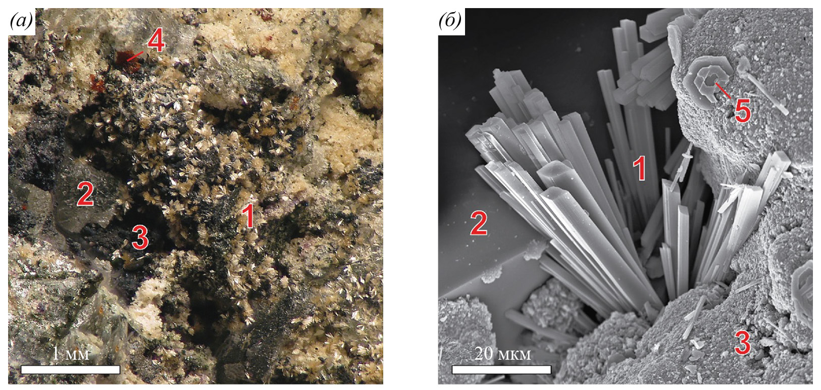 Рис. 3. Лучистые агрегаты кристаллов икорскиита (1), растущих на кристаллах кальцита (2), покрытых романешитом (3), манганонептунитом (4) и стронцианитом (5), из кварц-кальцитовой линзы в ийолит-уртите горы Кукисвумчорр.