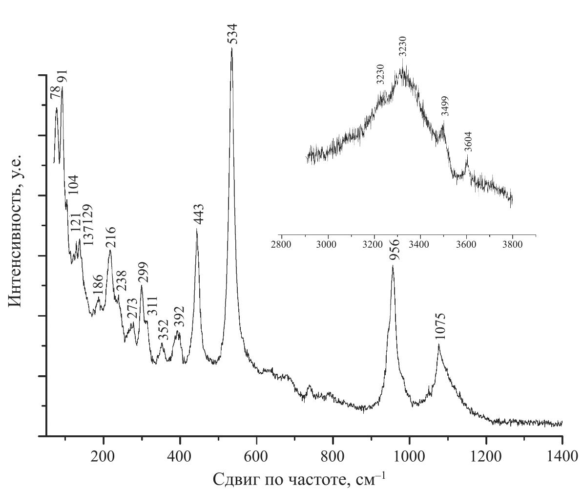 КР-спектр икорскиита приведен на рис. 4. Полосы 3230 пл (плечо), 3330 с (сильная), 3499, 3604 см−1 отнесены к валентным колебаниям О–Н связей в Н2О молекулах. Интенсивные полосы при 1075 и 956 см−1 относятся к симметричным и асимметричным модам валентных колебаний связей в тетраэдрах SiO4 (Паникоровский и др., 2017; Galuskin et al., 2012). Интенсивные полосы при 534 и 443 см−1 соответствуют различным модам деформационных колебаний в тетраэдрах SiO4 (Яковенчук и др., 2022). Слабые полосы при 392, 352 см−1 могут быть отнесены как к трансляционным модам O‒Mn‒O связей (McKeown et al., 1999), так и к симметричным модам деформационных колебаний Si‒O связей (Tlili et al., 1989). Полоса при 299 с плечом 311, а также слабая полоса при 273 см−1 могут быть интерпретированы как соответствующие валентным модам колебаний Mn‒O и Mn‒OH в MnO6 октаэдрах (McKeown et al., 1999; Tlili et al., 1989). Триплет полос при 238, 216 и 186 см−1 наиболее вероятно соответствует смешанным модам валентных колебаний Mn‒O связей (Qu et al., 2020), а также деформационным колебаниям OH‒Mn‒OH связей (McKeown et al., 1999). Полосы в низкочастотной области спектра (< 200 см−1) отнесены к колебаниям решетки.
