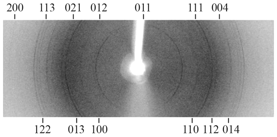 Порошковая рентгенограмма икорскиита (табл. 2, рис. 5) получена на дифрактометре Rigaku R-AXIS RAPID II (CoKα-излучение, l = 1.7892 Å), оснащенном полуцилиндрической рентгеночувствительной пластиной с оптической памятью (геометрия Дебая-Шеррера, диаметр 127.4 мм). Экспериментальные данные обработаны с использованием программы osc2xrd (Бритвин и др., 2017). По данным рентгеноструктурного анализа (РСА), минерал моноклинный, пространственная группа P21/c, a = 5.0339(4), b = 8.2329(7), c = 13.3484(10) Å, β = 93.953(7)°, V = 551.89(8) Å3, Z = 2. Параметры элементарной ячейки, уточненные по порошковым данным: a = 5.0714(3), b = 8.2731(5), c = 13.3740(11) Å, β = 93.730(5)°, V = 559.93(5) Å3. Восемь наиболее интенсивных линий дифрактограммы (I-d[Å]-hkl): 55-7.04-011; 41-4.318-110; 100-4.185-11-1; 24-3.956-021; 28-3.339-004; 19-3.095-014; 30-3.014-113; 70-2.939-12-2. Подробное описание кристаллической структуры будет дано в отдельной публикации.
