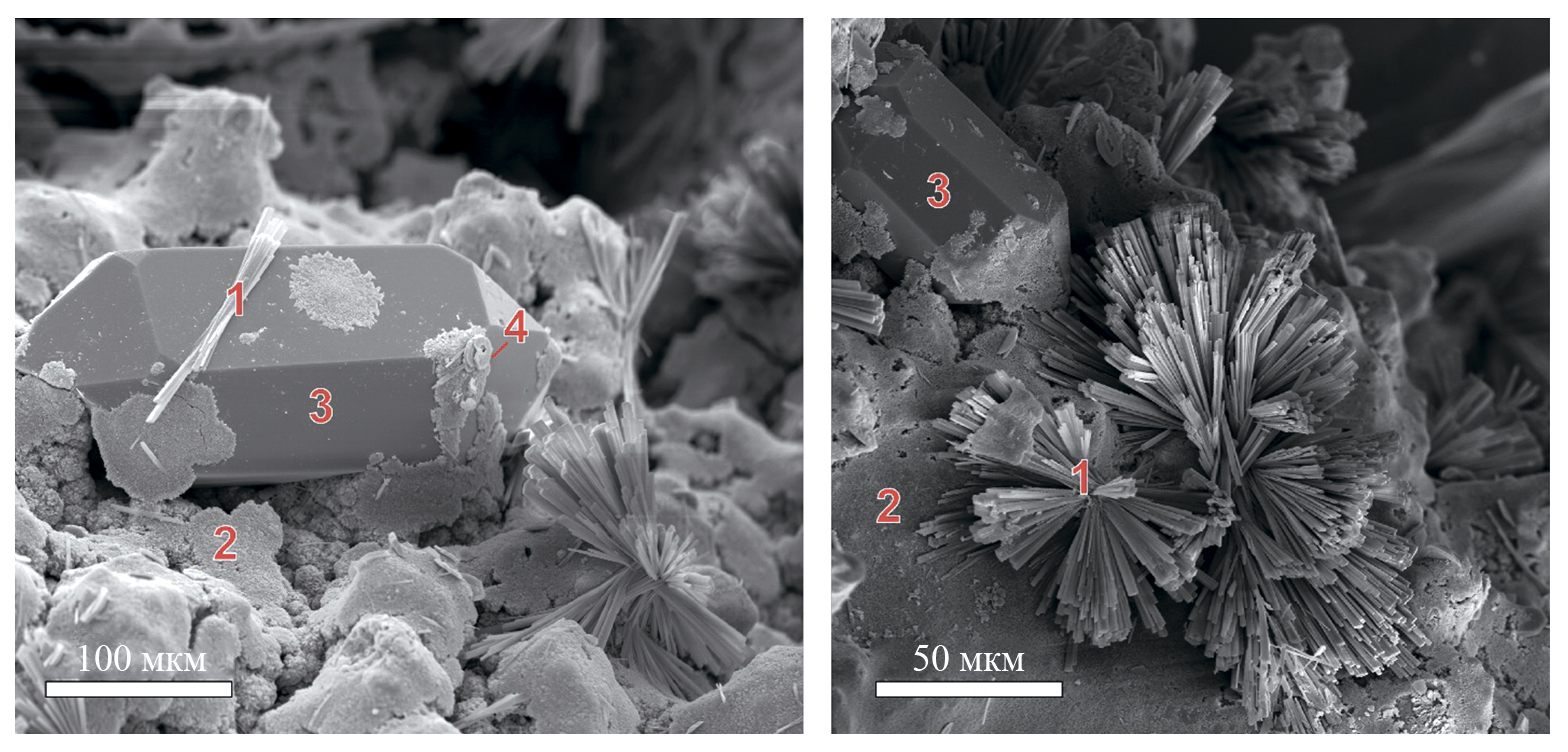 Рис. 6. Поздняя пегматитовая минерализация кальцитовой линзы +252 м горизонта Кировского рудника: 1 — икорскиит, 2 — романешит, 3 — кварц, 4 — стронцианит.