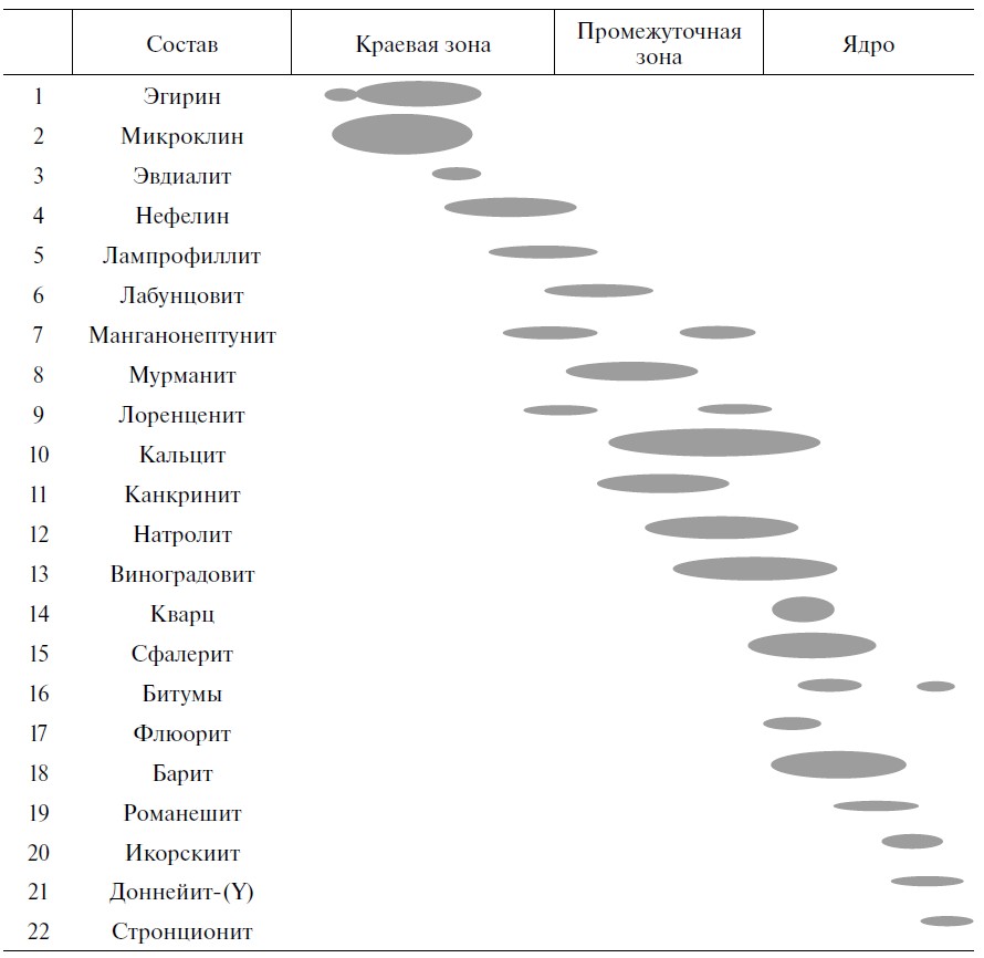 Большинство минералов в пегматитовом теле с икорскиитом, обнаруженном на горизонте +252 м Кировского рудника (табл. 4), имеют четкие возрастные взаимоотношения друг с другом. Наиболее ранними можно считать минералы краевой зоны, в которую входят крупные таблитчатые кристаллы микроклина (1) и радиально-лучистые агрегаты эгирина (2). Эвдиалит (3) нарастает на кристаллы микроклина и сферолиты эгирина, между которыми наблюдаются включения нефелина (4), а также лампрофиллита (5), реликты лабунцовита (6) и манганонептунита (7). Образование последних двух минералов можно условно отнести к переходу от пегматитовой (раствор-расплав) к гидротермальной стадии эволюции системы, с которой связано образование минералов, слагающих ядро пегматита.