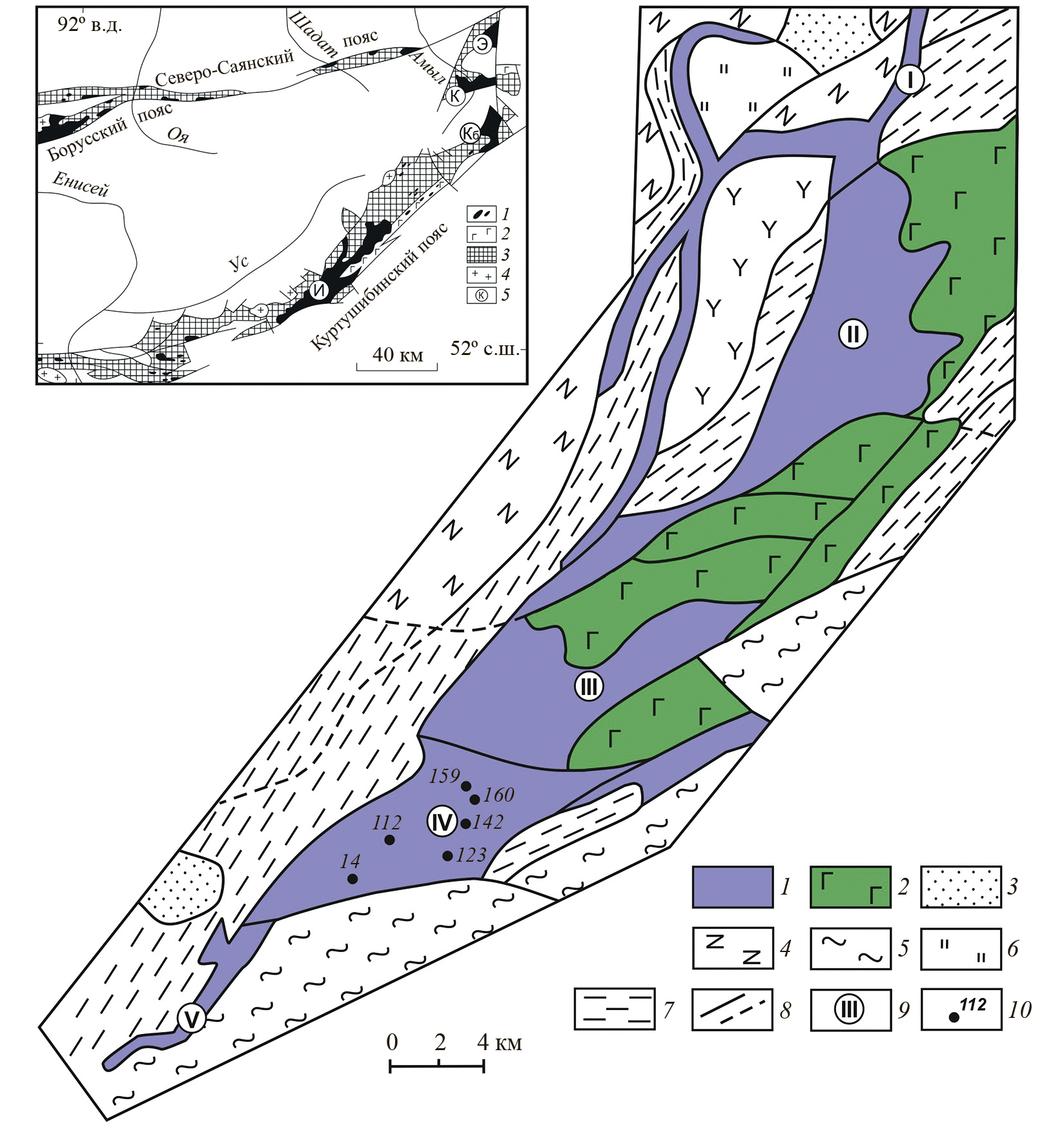 1 — ultramafic rocks: harzburgites, dunites, serpentinites; 2 — gabbroides (D); 3 — Shishtyk Formation: sandstones (S2); 4 — Amyl Formation: orthoschists and paraschists (Є2); 5 — Alasug Formation: metamorphosed conglomerates, gravelstones, sandstones, siltstones, shales (Є2-3); 6 — Tereshkinskaya Formation: siltstones, cherts, tuff sandstones, tuff conglomerates, algal limestones, porphyrites and their tuffs (Є1); 7 — Chinga Formation: spilite-diabase formation and carbonaceous-siliceous shales (Є1ch1); 8 — lines of tectonic contact (solid — reliable, dotted — assumed); 9 — tectonic blocks (I — Tikhovsky, II — Oreshsky (Koyardsky), III — Omulsky, IV — Idzhimsky, V — Sinyukhinsky); 10 — sampling sites.