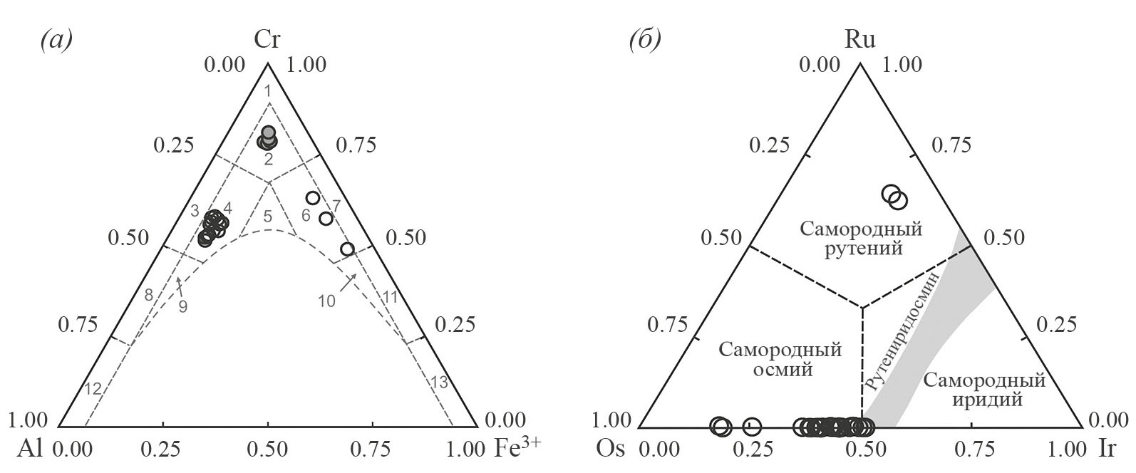a, composition of accessory chromospinelides from harzburgite (white circles) and dunite (gray circles) on classification diagram by N.V. Pavlov (1949) (1 — chromite, 2 — subferrichromite, 3 — aluminochromite, 4 — subferrialumochromite, 5 — ferrialumochromite, 6 — subaluminoferrichromite, 7 — ferrichromite, 8 — chromopicotite, 9 — subferrichromopicotite, 10 — subalumochromomagnetite, 11 — chromomagnetite, 12 — picotite, 13 — magnetite); б, composition of microinclusions of Os–Ir–Ru in pentlandite and avaruite from harzburgites on еру classification triangle (Harris, Cabri, 1991).