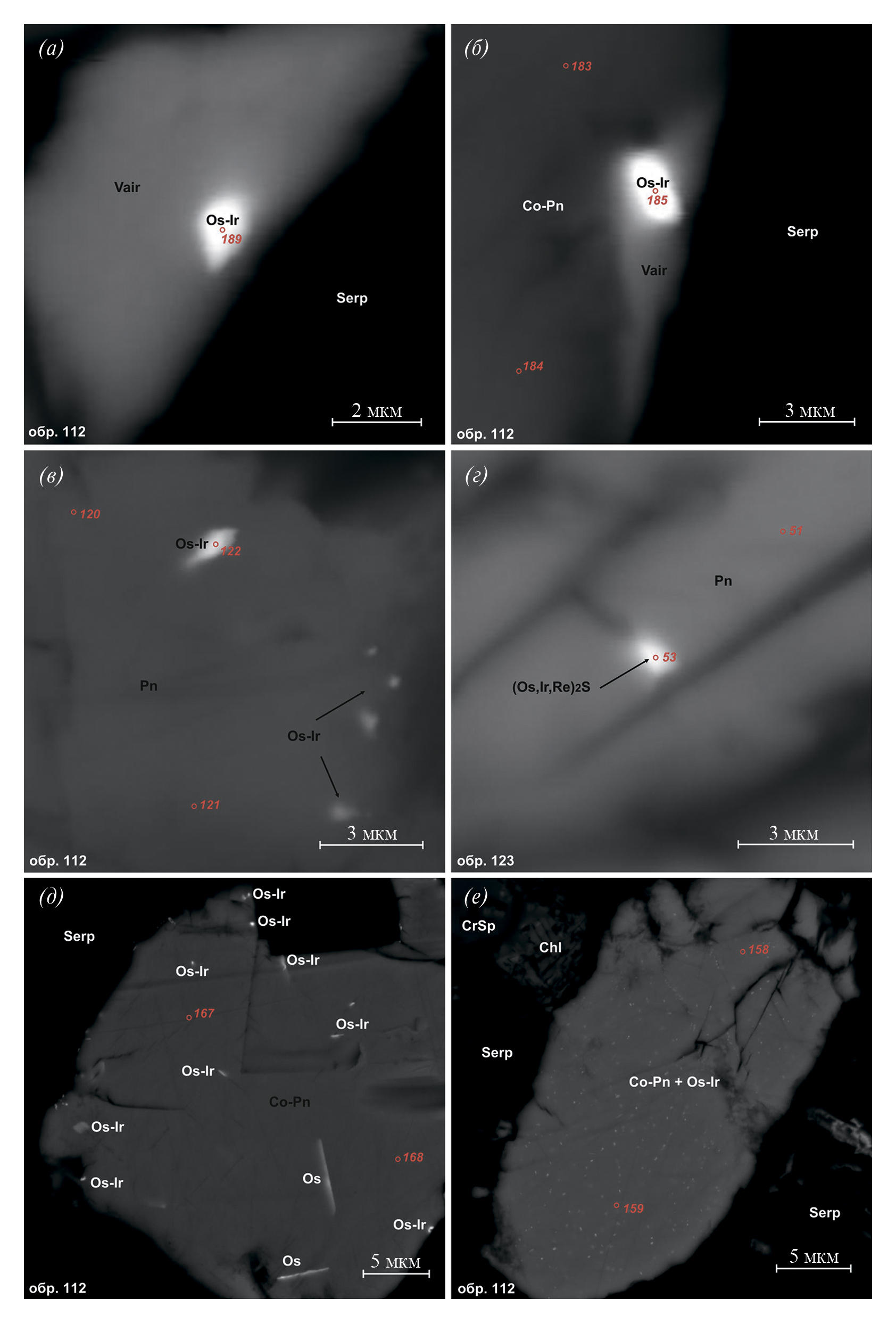 Сульфиды с формулой Me2S подразделяются на две подгруппы. В первой подгруппе в катионном ряду помимо Ru–Os–Ir-триады в значительных количествах присутствует никель (до 27.6 мас. %) и железо (до 37.4 мас. %), а также диагностируется примесь кобальта (до 2.0 %) (табл. 7). Такие сульфиды отмечаются в виде губчатых гипидиоморфных включений размером до 3 мкм в ассоциации с купропентландитом и вайрауитом либо наблюдаются в виде неправильных ксеноморфных включений, очевидно являющихся продуктом замещения гарутиита (рис. 6, а, в). Во второй подгруппе катионный ряд преимущественно представлен осмием и иридием (75–90 мас. %) при непостоянном присутствии примеси рения (до 10.0 мас. %), никеля (до 5.8 мас. %) и железа (до 5.3 мас. %). Сульфиды данной подгруппы отмечаются в виде гипидиоморфных включений с размером до 2 мкм, капсулированных в зернах кобальтистого пентландита (рис. 5, г).
