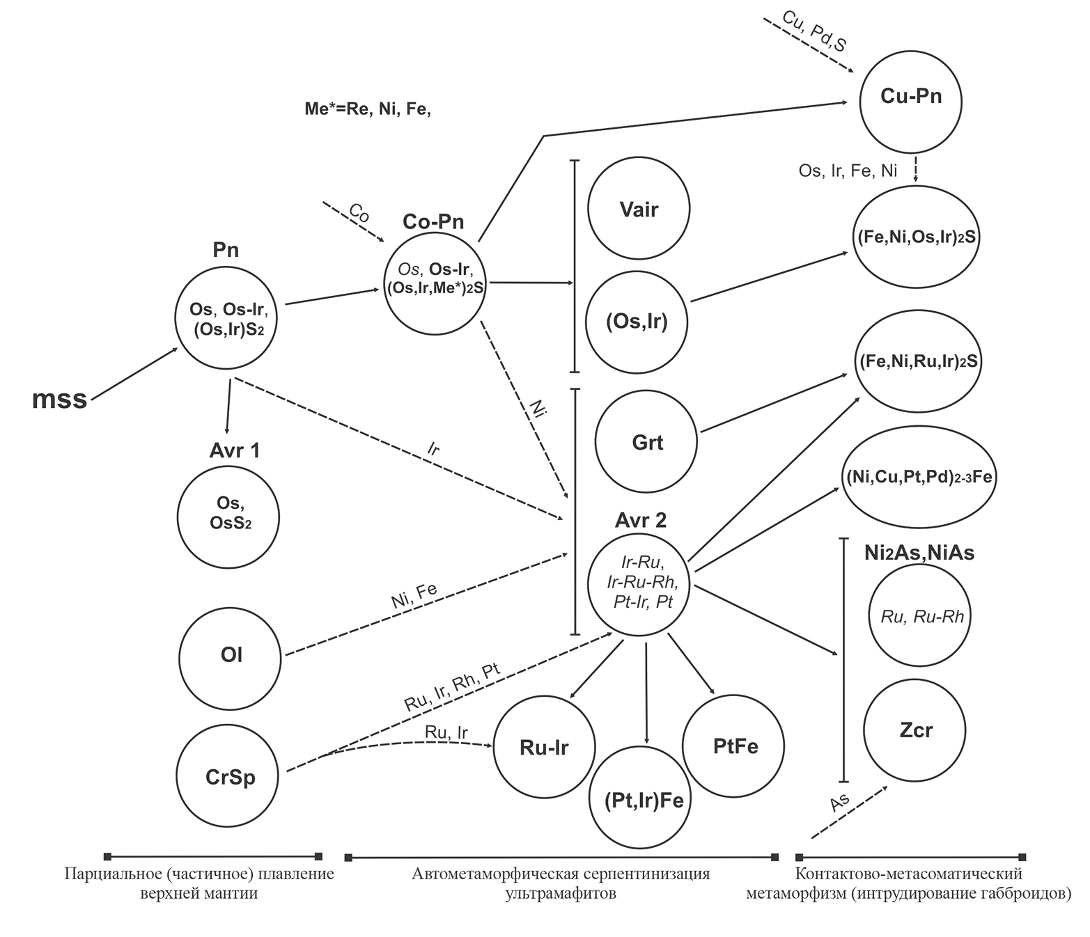 Рис. 7. Схема образования (преобразования) изученных МПГ. Жирным шрифтом в кружках показаны выявленные минералы; курсивом в кружках — примеси ЭПГ в минералах.