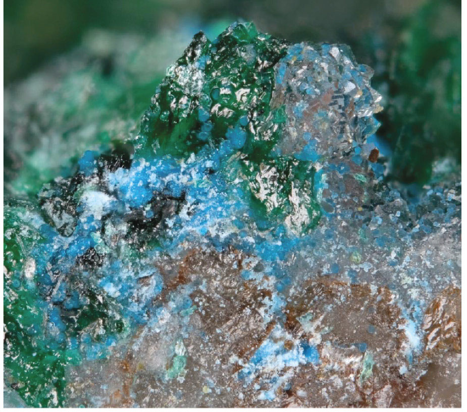 Fig. 3. Lednevite (sky-blue) on philipsburgite (green) with quartz. FOV: 3.3 × 3.7 mm. Photo by Maria D. Milshina.