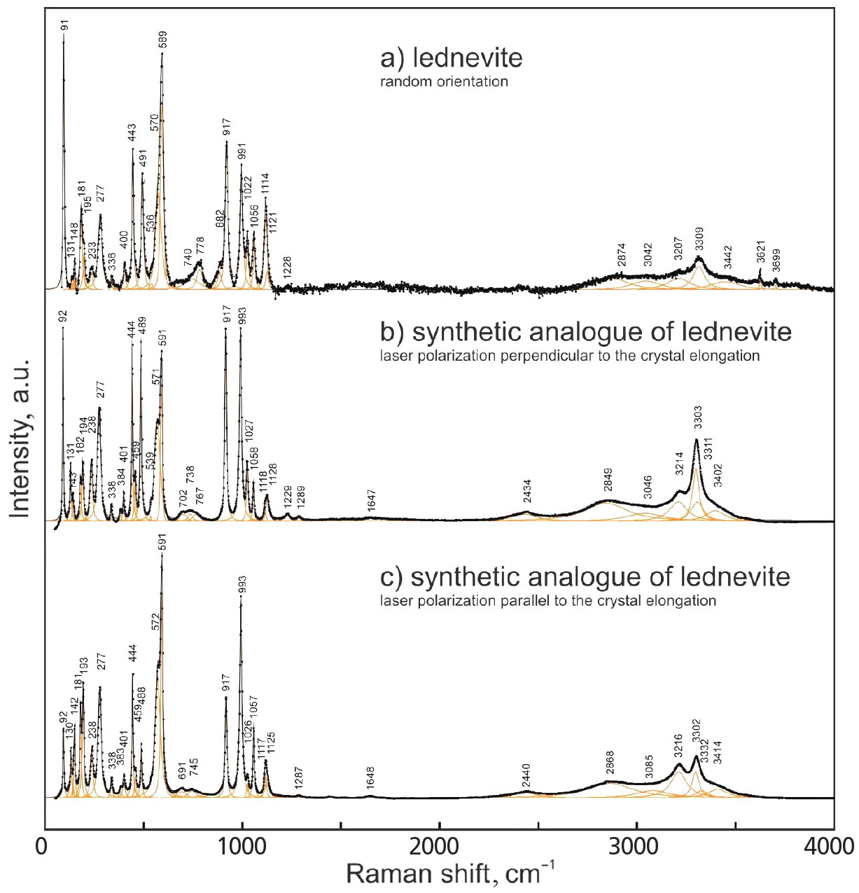 7. Fig. 6. The Raman spectra of a) lednevite, and b), c) its synthetic analogue excited by 532 nm laser in the 50–4000 cm–1 region. The measured spectrum is shown by dots. The curve matching to dots is a result of spectral fit as a sum of individual Voigt peaks shown below the curve. Spectra b) and c) were collected with the laser polarization perpendicular and parallel to the crystal elongation, respectively.