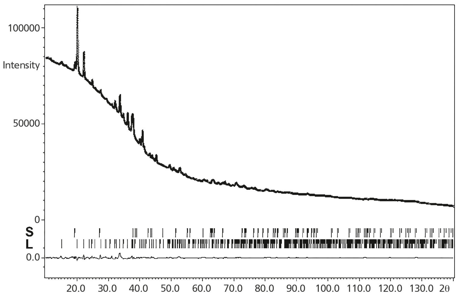 8. Fig. 7. Observed and calculated PXRD patterns of the sample containing lednevite (L) and spertiniite (S). The solid line corresponds to calculated data, the crosses correspond to the observed pattern, vertical bars mark all possible Bragg reflections. The upper row refers to spertiniite and the lower one to lednevite. The difference between the observed and calculated patterns is shown at the bottom.