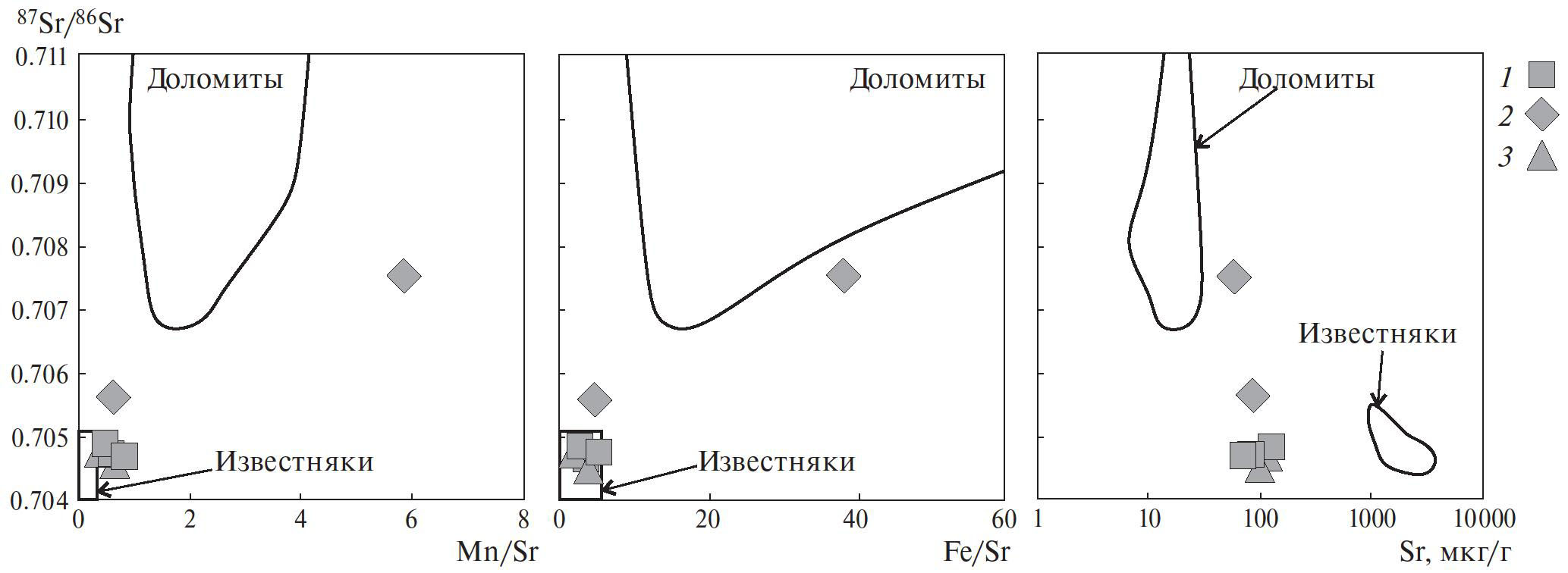Fig. 4. 87Sr/86Sr ratio versus Mn/Sr, Fe/Sr ratios, and Sr content for calcite from equigranular rock (1), inequigranular rock (2), veins (3). The fields with similar data for limestones of the Kazym Suite and dolomites of the Karagai Suite in the Satka Formation (Kuznetsov et al., 2008) are shown on diagrams.
