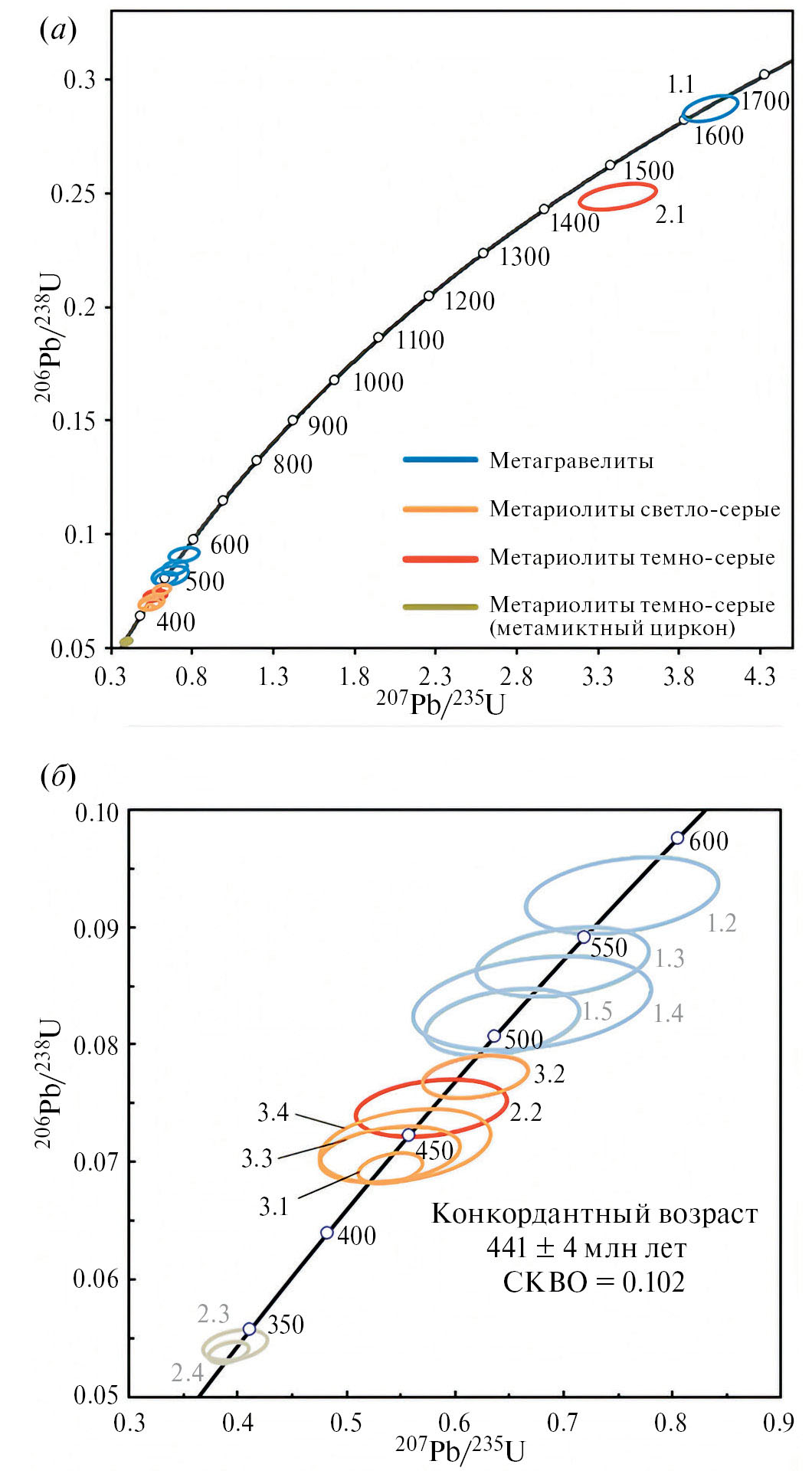В результате последующей обработки аналитические результаты были отфильтрованы по критерию дискордантности. Для циркона мономинеральных проб были исключены значения с D > 5 % (оставшееся число датировок — 13). Для циркона, находящегося непосредственно в породе, рассматривались значения с D < 15 % (оставшееся число датировок — 8), однако для расчета возрастов учитывались только значения с D < 5 %. Диаграммы с конкордией были построены с использованием программы ISOPLOT/EX (Ludwig, 2003), эллипсы ошибок приведены на уровне ±1σ.