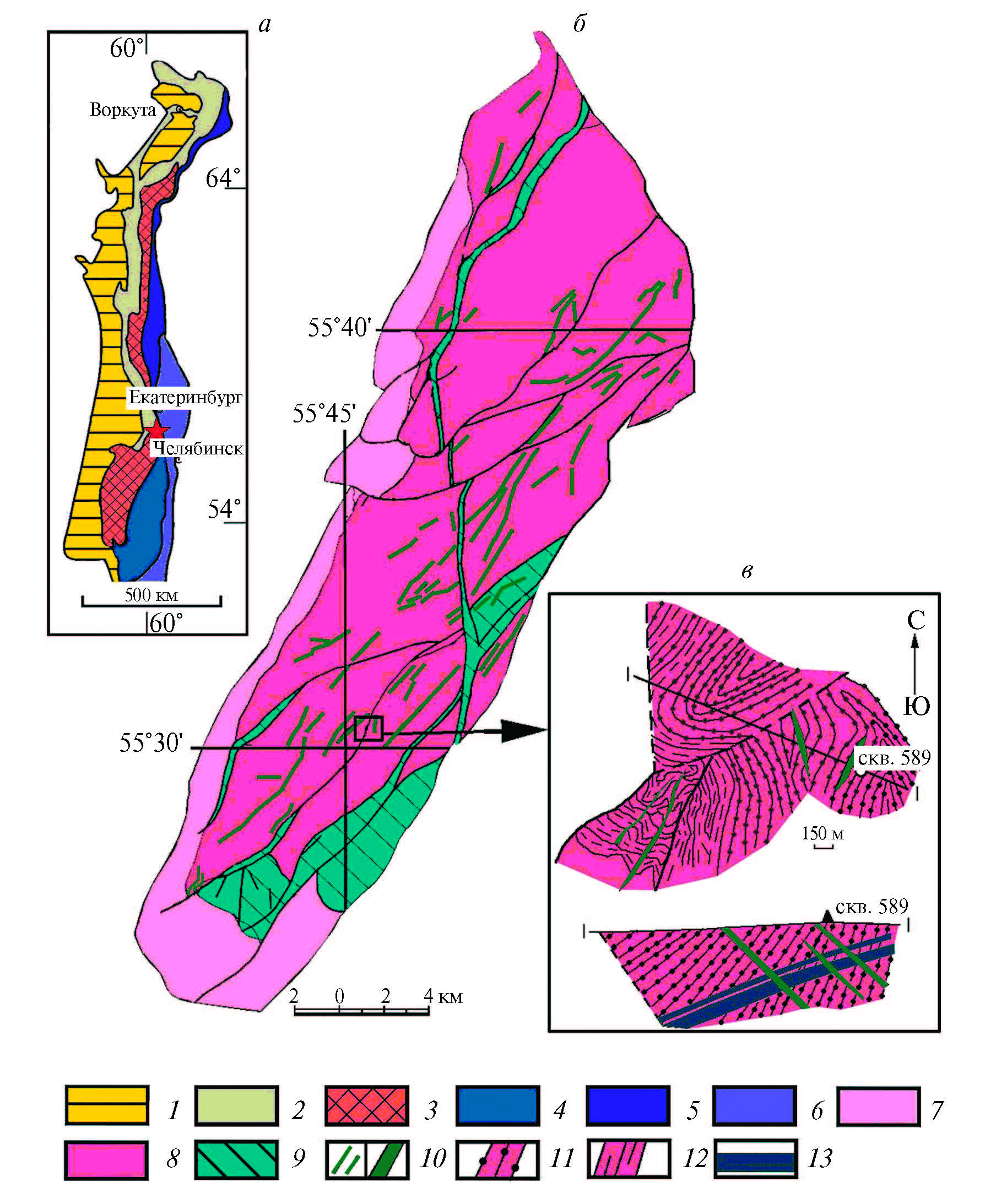 Мегазоны Урала: 1 — Предуральская; 2 — Западно-Уральская, 3 — Центрально-Уральская, 4 — Тагильская, 5 — Магнитогорская, 6 — Восточно-Уральская; 7 — отложения айской свиты (RF1); 8 — архей-протерозойские отложения нерасчлененные; 9 — тектонические зоны с бластомилонитами; 10 — разновозрастные дайки базитов; 11 — мигматиты; 12 — гранат-биотитовые гнейсы; 13 — расслоенные тела мисаелгинского комплекса.