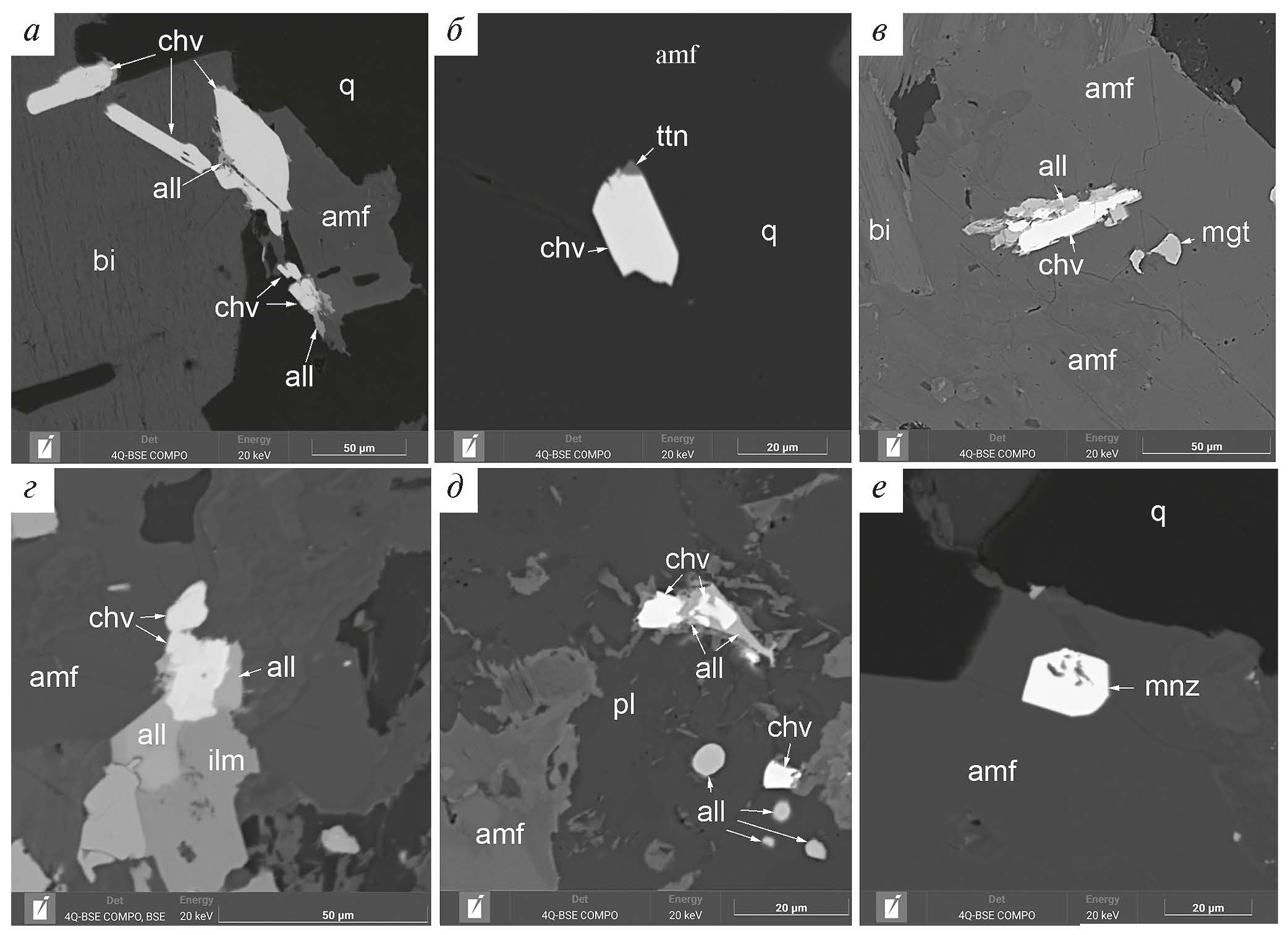 chv — минералы группы чевкинита, all — алланит, amf — амфибол, bi — биотит, ttn — титанит, mgt — магнетит, ilm — ильменит, pl — плагиоклаз (олигоклаз), q — кварц.