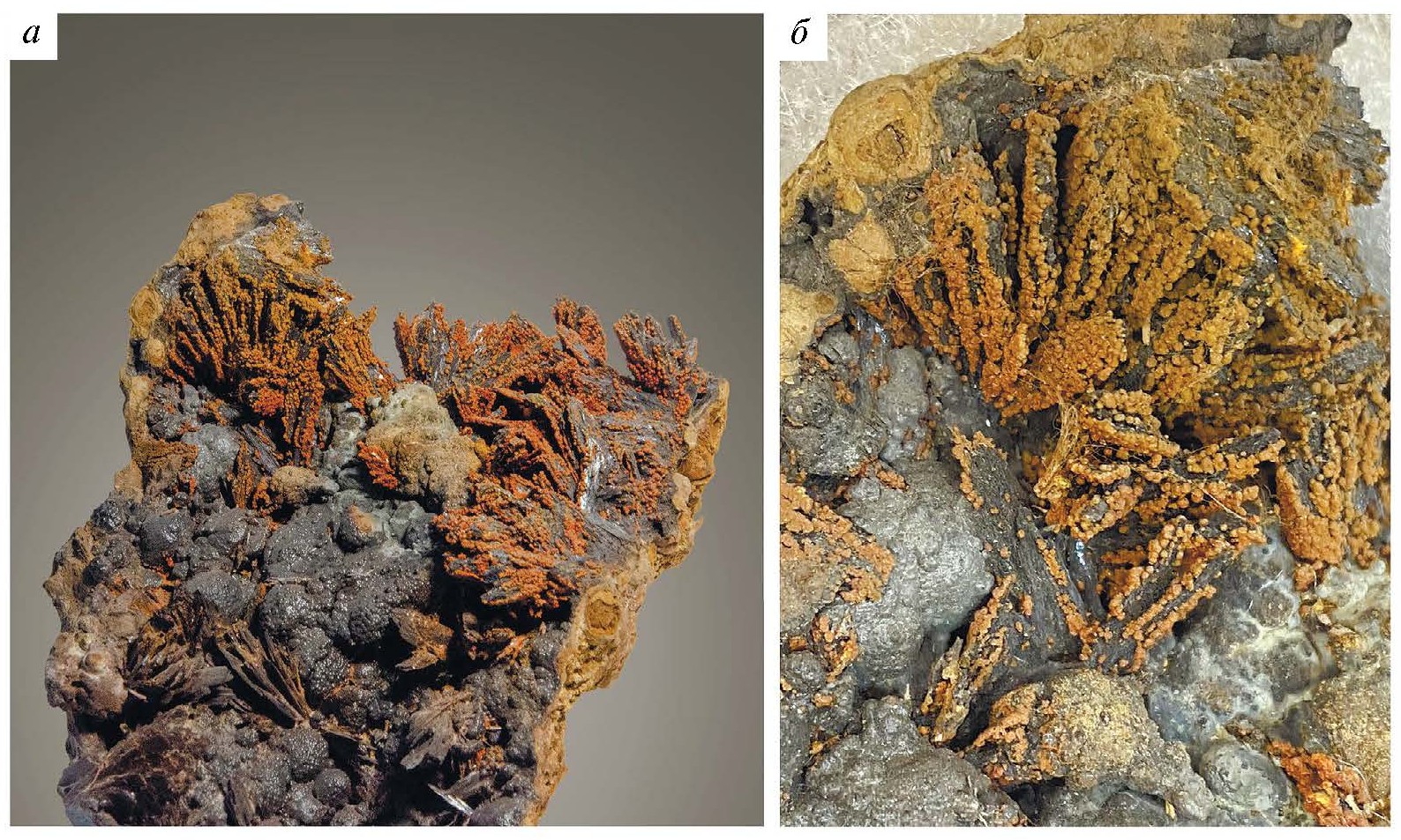 Изученные нами образцы сантабарбараита были отобраны в 2008 году на восточном борту карьера А Камыш-Бурунского месторождения. В борту карьера, на высоте один метр выше уровня воды обнажается слой окисленных коричневых оолитовых руд, содержащих отдельные мелкозернистые плотные конкреции зеленовато-серого сидерита, по верхнему контакту которых развиты вытянутые уплощенные полости до 40 см в поперечнике, содержащие радиально-лучистые и сноповидные агрегаты пластинчатых кристаллов сантабарбараита охряно-коричневого цвета, наросшие на тонкую корку сидерита черного цвета с синеватым отливом (рис. 1). В редких случаях в западной части карьера А и в карьере В среди окисленных и табачных руд встречаются полости, содержащие частичные псевдоморфозы сантабарбараита по пластинчатым кристаллам вивианита (рис. 2), друзовые, радиально-лучистые и сталактитоподобные агрегаты пластинчатых кристаллов вивианита, а также голубые и ярко синие порошковатые агрегаты вивианита более поздних генераций. Западнее в карьере Е встречается, в основном, вивианит, редко — метавивианит, диагностированный нами рентгенографическим и ИК-спектроскопическим методами; сантабарбараит здесь установлен не был.