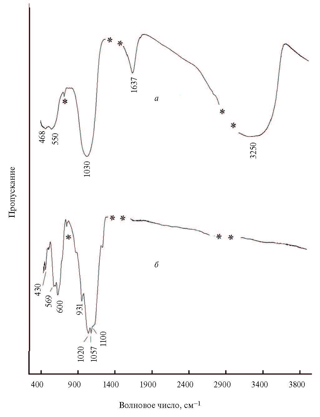 Рис. 3. Спектры инфракрасного поглощения: изученного сантабарбараита (а) и продуктов его нагревания до 800 оC (б).
