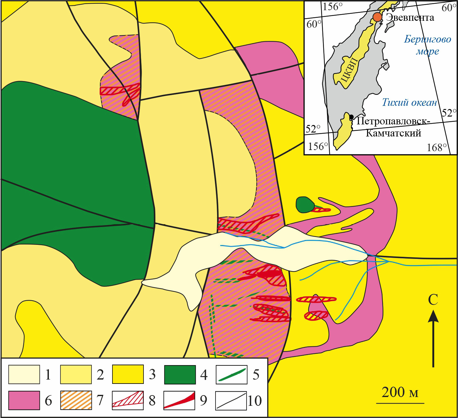 1 — пролювиальные четвертичные отложения; 2 — миоцен-плиоценовые андезибазальты, андезиты и их туфы; 3 — средне-позднемиоценовые андезибазальты, андезиты, дациандезиты, дациты и их туфы; 4 — субвулканические тела андезитов; 5 — дайки базальтов; 6 — субвулканические тела дацитов; 7 — зоны аргиллизации; 8 — зоны прожилкования; 9 — жилы; 10 — разрывные нарушения. На врезке: расположение рудопроявления Эвевпента в пределах Центрально-Камчатского вулканического пояса (ЦКВП).