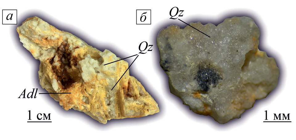a — sample of vein of plate texture, composed of adularia (Adl) and quartz (Qz); б — black spots on quartz matrix (Qz), saturated with tellurides, sulfides, and native gold.