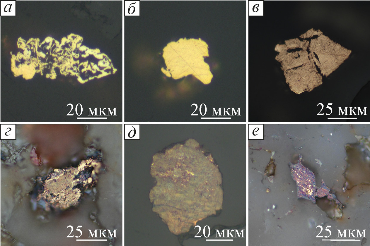 Оптическая микроскопия. По цвету, отражательной способности и внутреннему строению зерен выделено два основных типа золота (рис. 3). Золото первого типа обладает высокой отражательной способностью, цветом от бело-желтого до золотисто-желтого, а также однородным внутренним строением (рис. 3, а, б). Размер зерен варьирует от 20 до 140 мкм. Золото второго типа обладает низкой отражательной способностью, цветом от коричневато-желтого, бронзово-желтого до коричневого и красно-бурого (рис. 3, в‒е). Зерна угловатые, ксеноморфные по отношению к жильным минералам (рис. 3, г, е). Размер зерен составляет от 3 до 200 мкм. Внутренняя текстура неоднородная пористая, трещиноватая (рис. 3, в‒е). По своим оптическим характеристикам и особенностям внутреннего строения, золото второго типа напоминает «горчичное» золото, которое описано, например, на месторождениях Малетойваям (Tolstykh et al., 2019) и Донпин (Wang et al., 2020). Золото первого типа было отнесено к более раннему гипогенному.