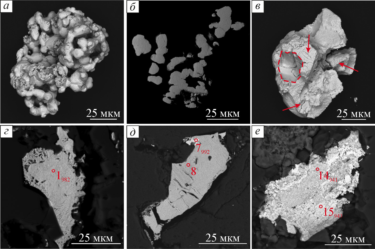 a, б — dendritic form with simple internal structure of hypogenic gold; в — fractured grain of mustard gold, the red contour is a needle trace, red arrows indicate fractures resulted from interaction; г — porous grain of mustard gold; д — collomorphic texture of mustard gold in aggregation with Ag sulfides and areas of high-grade gold with simple internal structure (white); е – mustard gold with areas saturated with Fe oxides (light gray). SE images (a, в) and BSE images (б, г–е). Points 1, 7, 8, 14, 15 correspond to the analysis numbers in Table 2, the indices show the gold probe.