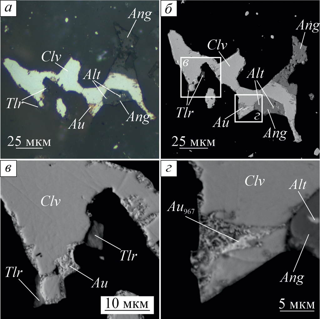 a — calaverite (Clv) with a border of mustard gold (Au) in conjunction with anglesite (Ang) and tellurite (Tlr), relicts of altaite (Alt) in anglesite, photo in reflected light; б — the same in back-scattered (BSE) electrons; в — fringes of mustard gold along calaverite and tellurite on calaverite; г — mustard gold along a crack in calaverite. Image in reflected light (a) and BSE images (б–г).