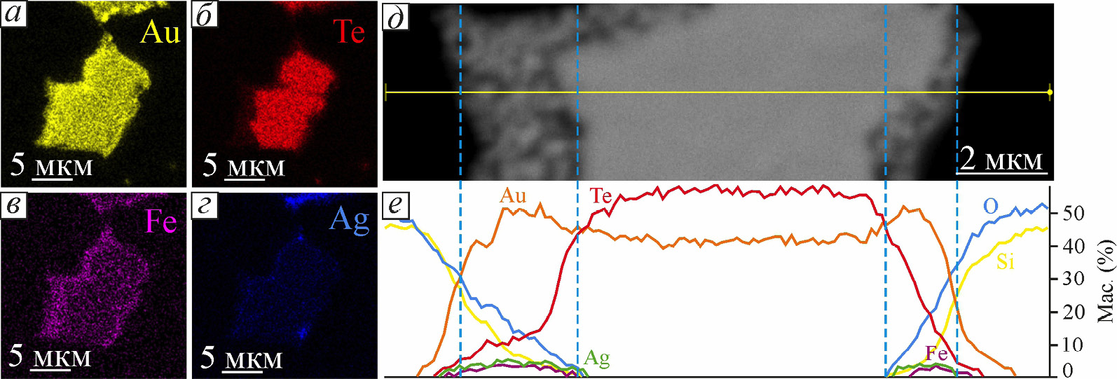 a–г — maps of elemental composition; д — image of the mustard gold rim around calaverite in back-scattered electrons (BSE); е — distribution of elements along the horizontal scan line.