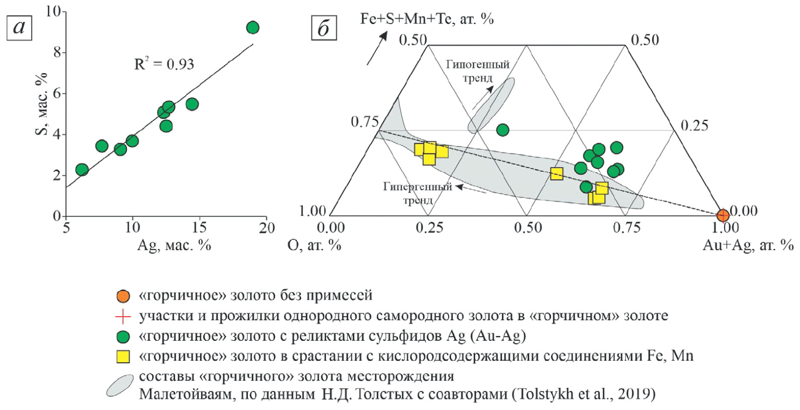 Особенности химического состава «горчичного» золота. На основании оптических характеристик, морфологических особенностей и химического состава можно выделить четыре разновидности «горчичного» золота (табл. 2, рис. 8): (1) «горчичное» золото без примесей, (2) участки и прожилки однородного самородного золота в «горчичном» золоте, (3) «горчичное» золото с реликтами сульфидов Ag (Au-Ag) и (4) «горчичное» золото в срастании с кислородсодержащими соединениями Fe, Mn. На диаграмме в координатах Ag–S (рис. 8, а) фигуративные точки составов «горчичного» золота выстраиваются в единый ряд, что позволяет говорить о корреляционной связи между содержанием S и Ag в анализах. Это было проинтерпретировано, как присутствие в срастании с «горчичным» золотом реликтовых серебросодержащих сульфидов [акантита (Ag2S), ютенбогардтита (Ag3AuS2), петровскаита (AgAuS)], вероятно, более устойчивых по сравнению с калаверитом. По данным порошковой рентгеновской дифрактометрии в срастании с «горчичным» золотом установлен хлораргирит (AgCl). Ранее «горчичное» золото в срастании с акантитом и хлораргиритом было обнаружено на месторождении Оленинское, Кольский полуостров (Kalinin et al., 2019). Присутствие Fe в составе «горчичного» золота связывают с выполнением пор гётитом (Kalinin et al., 2019; Tolstykh et al., 2019). Аналогично, присутствие Mn можно связать с наличием его кислородсодержащих соединений в порах. Важно отметить, что полученные параметры элементарной ячейки самородного золота не позволяют предполагать вхождения значительного количества изоморфных примесей в его структуру [как, например, было показано ранее для палладий-ртутьсодержащего золота из россыпи р. Итчайваям, Снеговой хребет, Корякское нагорье (Palyanova et al., 2023)]. Поэтому, присутствие Fe, Mn, O в химическом составе «горчичного» золота главным образом связаны с минералами, заполняющими поры в нем.