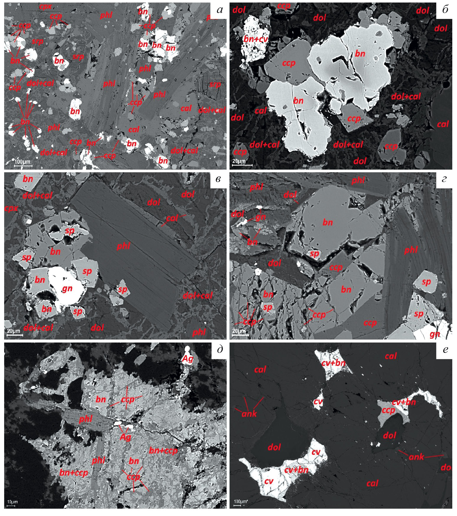 bn — bornite, ccp — chalcopyrite, cv — covellite, sp — sphalerite, gn — galena, Ag — native silver, phl — phlogopite, cpx — clinopyroxene, srp — serpentine, dol — dolomite, cal — calcite, ank — ankerite. BSE images.