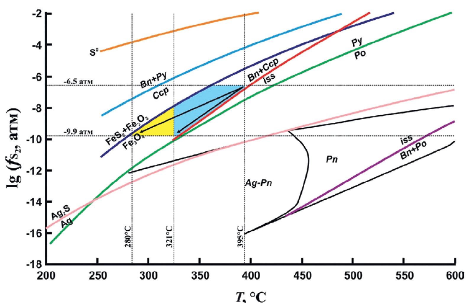Рис. 6. Упрощенная диаграмма lg fS2 — T с границами устойчивости минералов железа, меди и серебра (Сорохтина и др. 2021). Синим цветом обозначено поле кристаллизации сульфидных минералов Спиридон-Ты при температурах и летучести серы, определенных по электрум–сфалеритовому геотермометру. Желтым цветом показана низкотемпературная часть поля кристаллизации при температуре, определенной по борнит–халькопиритовому геотермометру и летучести серы по электрум–сфалеритовому геотермометру. Стрелками показаны направления изменения температуры и летучести серы в процессе кристаллизации сульфидных минералов.